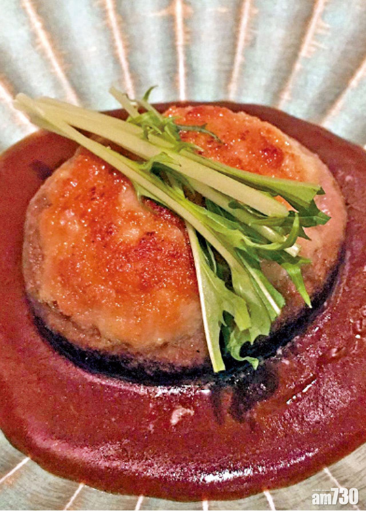 Ronald師傅表示,除了豐洲市場和本港貨運的定休日,餐廳一星期五天都有新鮮魚獲到港。他擅長於割烹料理,這是日本一種傳統的料理形式,屬高級的居酒屋料理。從字面上解釋,割是指是用刀處理食材,而烹是指加熱煮食,因此是結合了新鮮切割與熱食的料理。他以菇出產自北海道,有冬菇界中的「首領」之稱的厚身大統領冬菇,釀入九州鹿兒島南國元氣雞和車打芝士肉燒焗。上碟時淋上用牛骨和洋蔥等自家製的漢堡扒汁,加入洋食風味。值得一提的,是Ronald師傅獲SSI日本清酒(唎酒師)資格,不妨可向他請教一下sake pairing的專業意見。