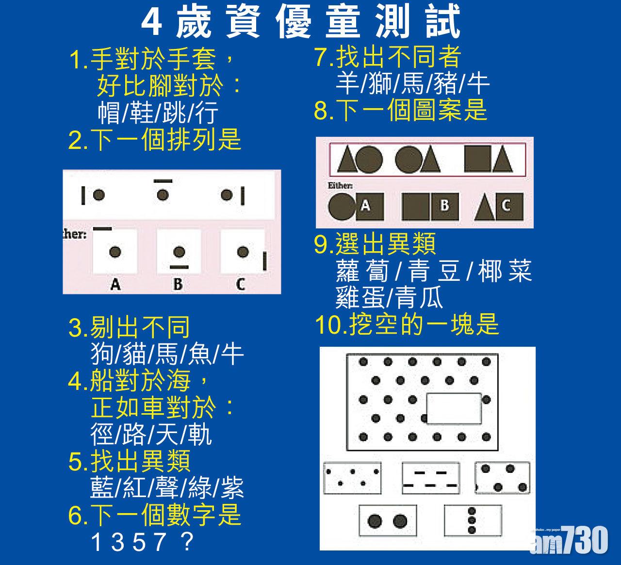 就說Elsie吧,喜以太陽系、貓頭鷹特徵等議題「招呼」爸媽,自學元素周期之餘,更列制出鐵的原子序數。Lillyan則事事早人一步,歲餘識認字母、2歲由1數到200,3歲入讀幼稚園令老師驚為天人,鼓勵接受門薩IQ測試(得出158),5歲能自閱8歲童書,現跳班唸小二。若要測測你家孩子IQ,答對這10題真恭喜晒了 。