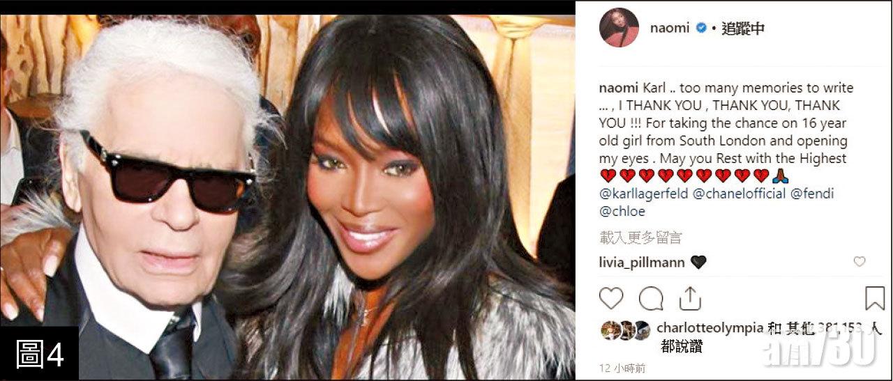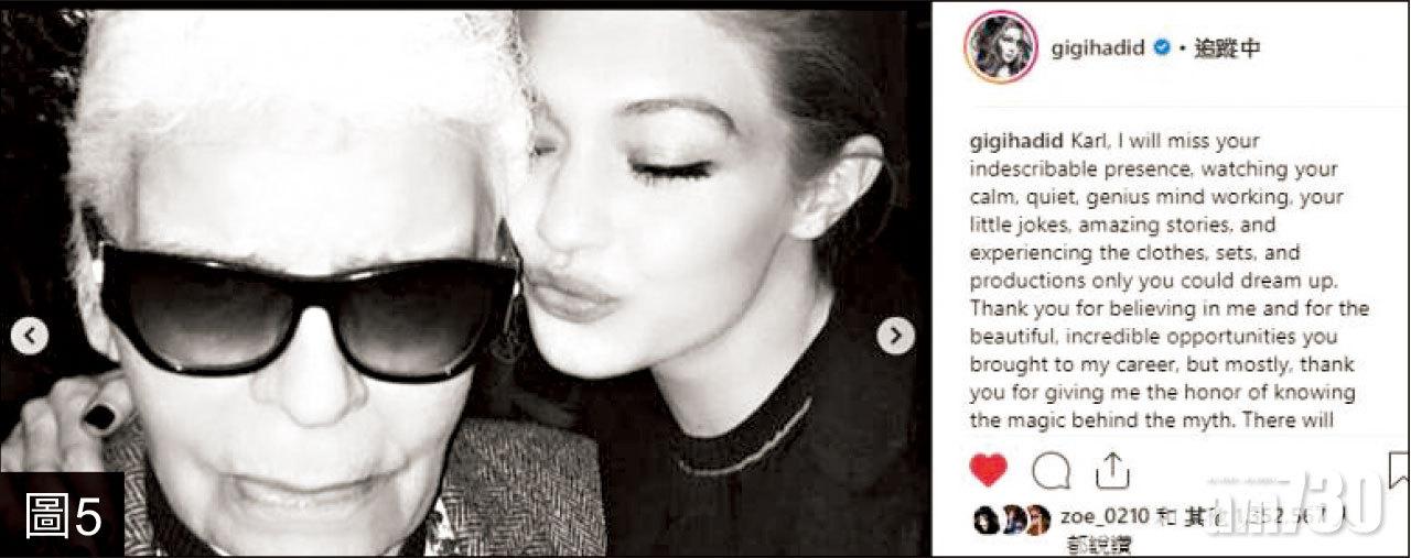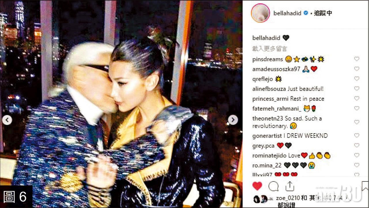 另外,不同年代的超模分別在社交網發表與Karl的合照追悼,黑珍珠Naomi campbell(圖4)、Gigi Hadid(圖5)、Bella Hadid(圖6)都分別PO出多張曾與Karl工作時的合照,尤其是Hadid兩姐妹花跟Karl的貼面啜啜相,更令人懷念。
