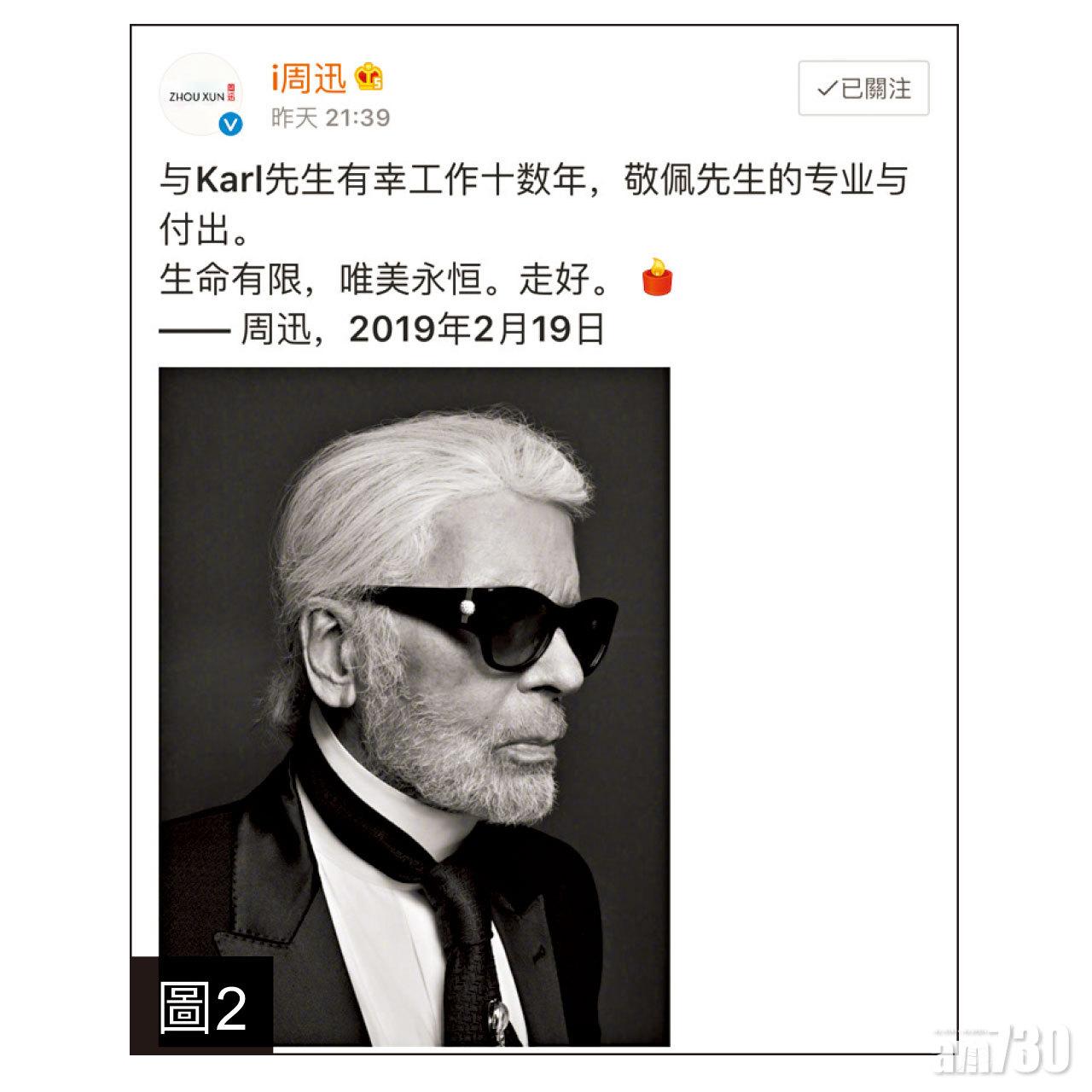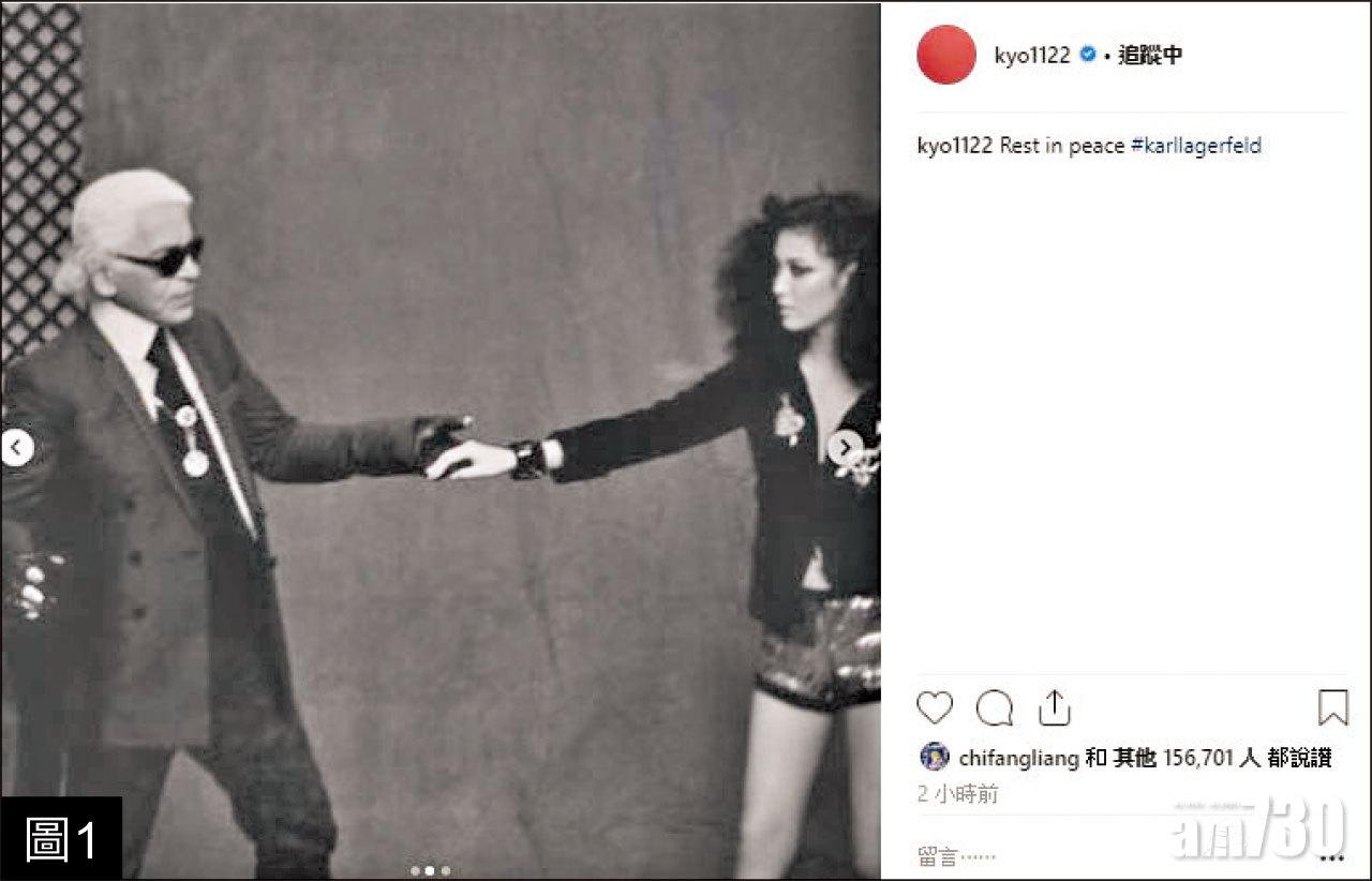 韓國女星宋慧喬(圖1)今日在IG貼出2012年跟老佛爺合作拍攝《The Little Black Jacket》的照片,這張由老佛爺牽著她的手的POSE相非常經典,喬妹寫上「Rest In Peace」悼念。周迅更是Chanel騷場的重要嘉賓,在得知老佛爺離世後,周迅(圖2)在個人微博寫出了對Karl的懷念之言。