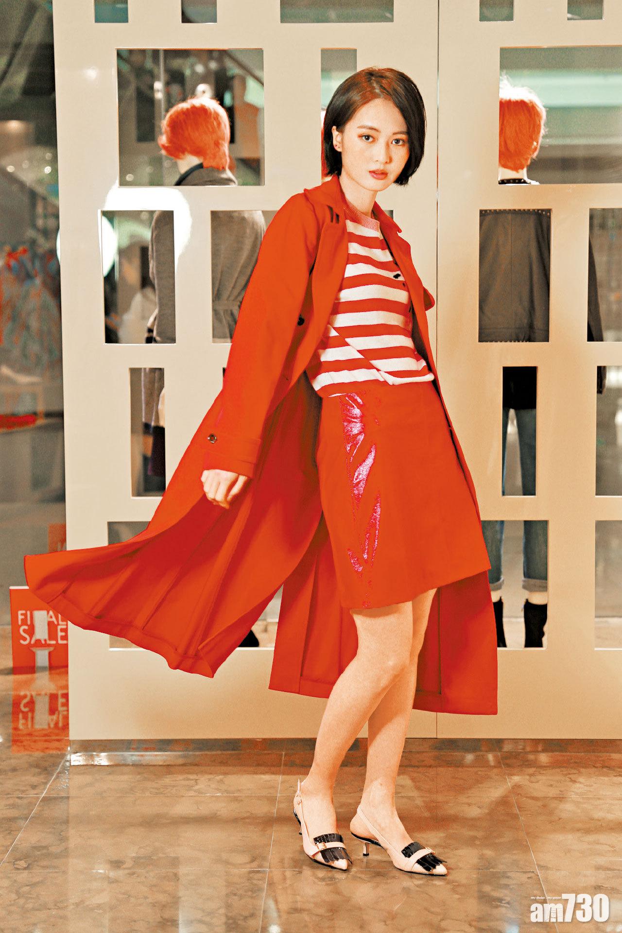 紅色trench coat $4,980(A); 紅白色橫間knit top $2,880(A); 紅色仿皮mini skirt $1,480(A); 粉紅拼黑色high heel $2,080(A)