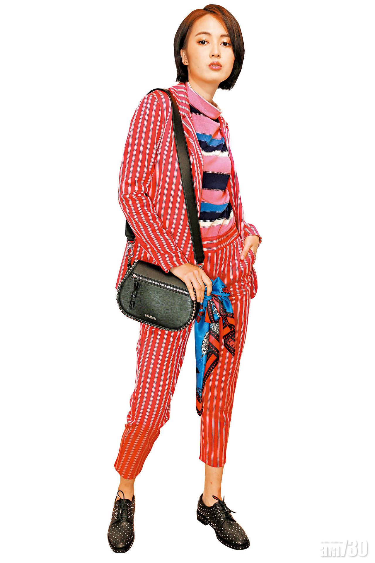 粉紅白色條紋blazer $2,880(E); 粉紅黑色橫間knit top $1,780(E); 粉紅白色條紋suit pants $2,280(E); 黑色皮革綴鉚釘、絲布shoulder bag $1,780(E); 黑色皮革鉚釘shoes $2,780(E)