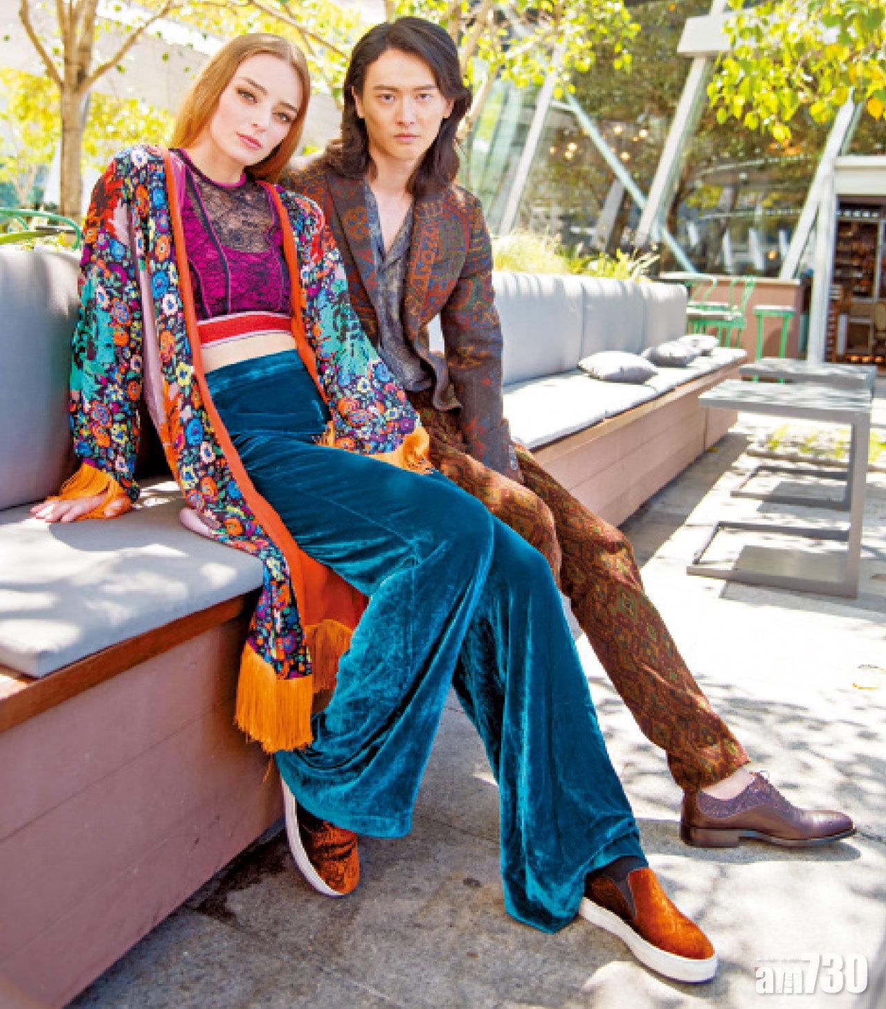 (左)牆紙印花西裝 $18,200 恤衫 $7,100 牆紙印花絨面西褲 $4,800 (右)高領波西米亞紗裙 $29,800 黑色腰帶 $3,750 黑白地氈印花手袋 $20,068