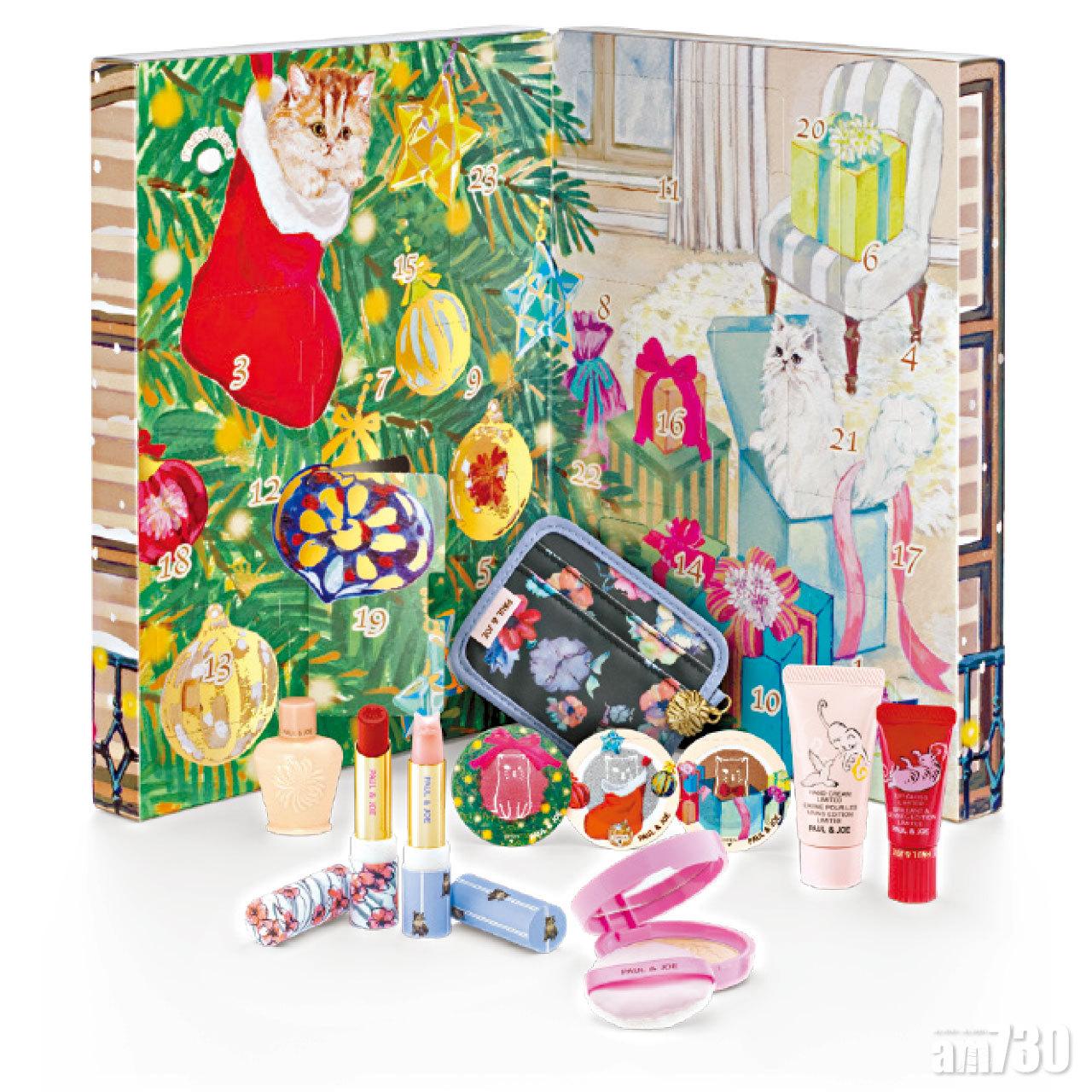 今年的聖誕包裝插畫,以PAUL & JOE設計師Sophie Mechaly的兩隻愛貓為主角,日曆內有12件精美小禮物,包括3款令人愛不釋手的多用途彩妝卡、限定的唇彩、唇膏、粉餅及卡片套等。系列另包括唇霜、手乳霜及護膚皂,滋潤咀唇及雙手之餘,更帶有熱葡萄酒及德式聖誕蛋糕的香氣,令節日氣氛更濃。