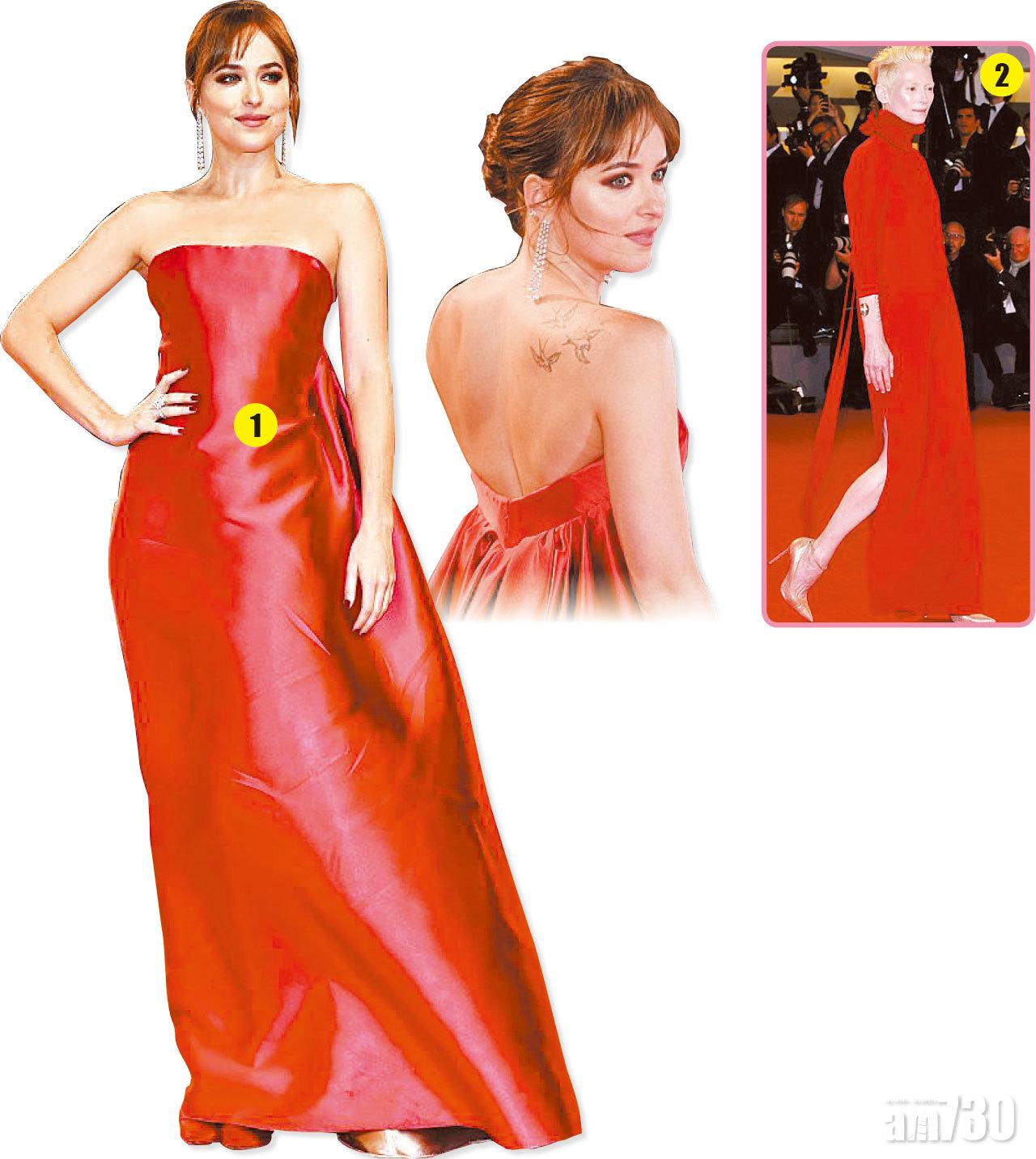 於周六《陰風陣陣》(Suspiria)首映禮上,最矚目當數女主角狄高達莊遜(Dakota Johnson,28歲,圖1),Christian Dior豔紅tube晚裝,天使細節在腰背;拍檔泰達史雲頓(Tilda Swinton,57歲,圖2)的維多利亞式高領紅裙,貴乎型格氣派。披上金縷高叉曳尾晚裝的名模Bruna Marquezine(23歲,圖3),定教球星男友尼馬倍感自豪。姬蒂白蘭芝(Cate Blanchett,49歲,圖4)則回味八十年代高雅單肩,塔夫綢巨型袖子上身,配以天鵝絨緊貼長裙,仙氣金黑配。同是明年「入五」的納奧美屈絲(Naomi Watts,圖5),以Ralph & Russo的含蓄透視裙,示範了半百佳人的風姿。
