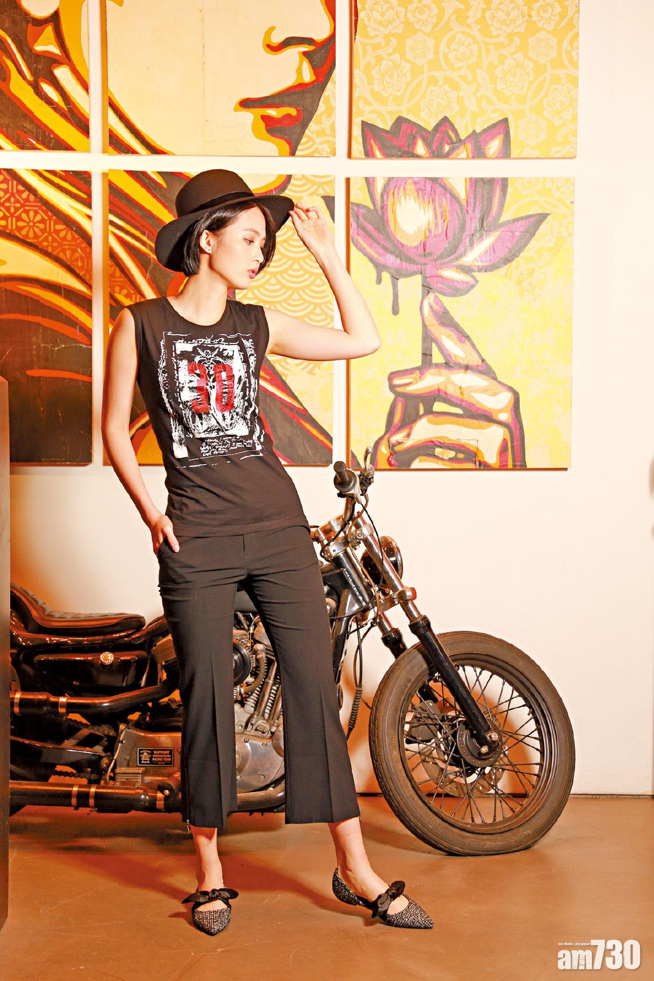 黑色字花圖案vest $2,299(M); 黑色呢絨hat by Rag & Bone $2,499(A); 黑色suit pants stylist own; 黑白色織布綴蝴蝶結flat shoes by Havmoon $399(A)
