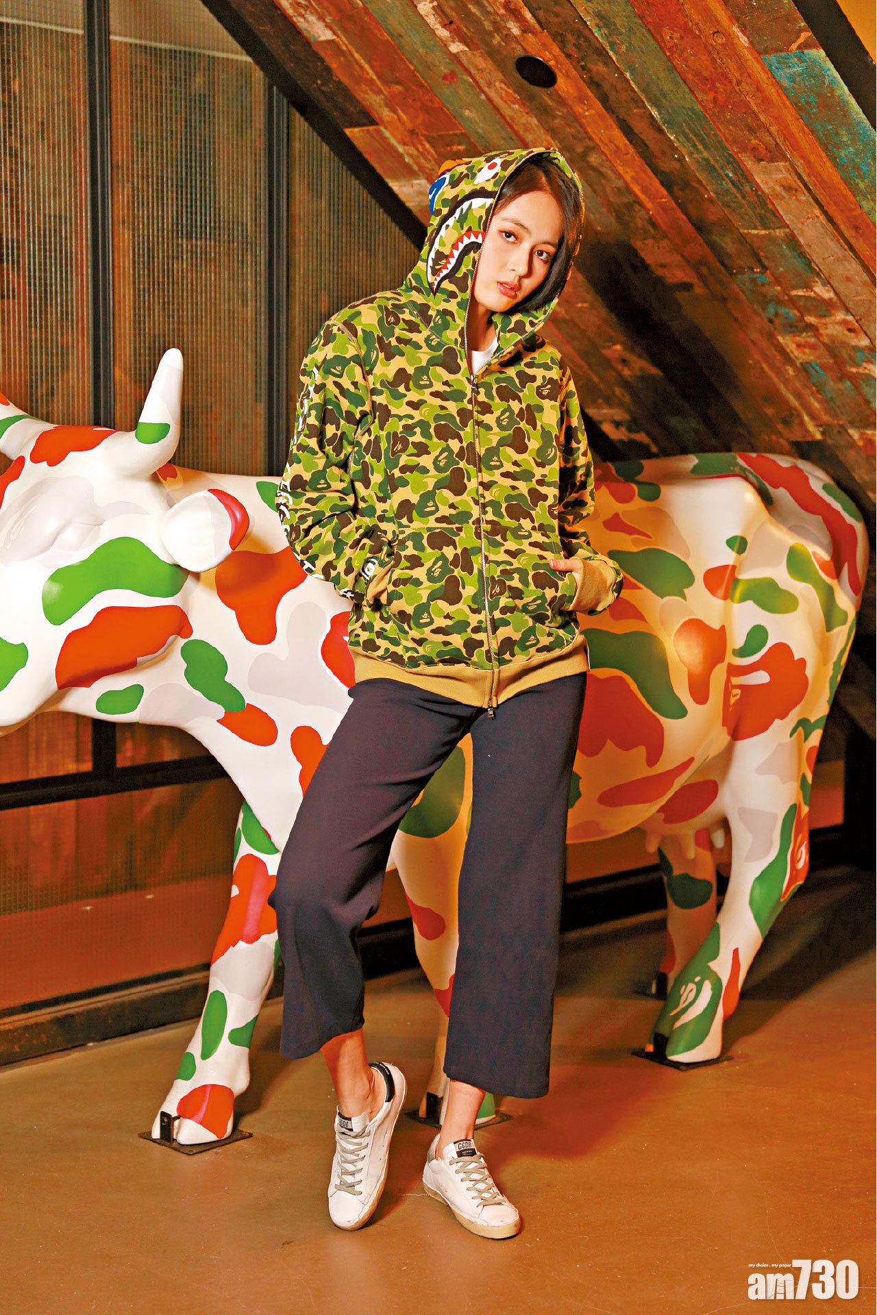 猿人迷彩鯊魚hoodie $3,499(N); 黑色cropped pants $2,400(L); 白色星紋仿舊sneaker by Golden ;Goose Deluxe Brand $4,999(A)