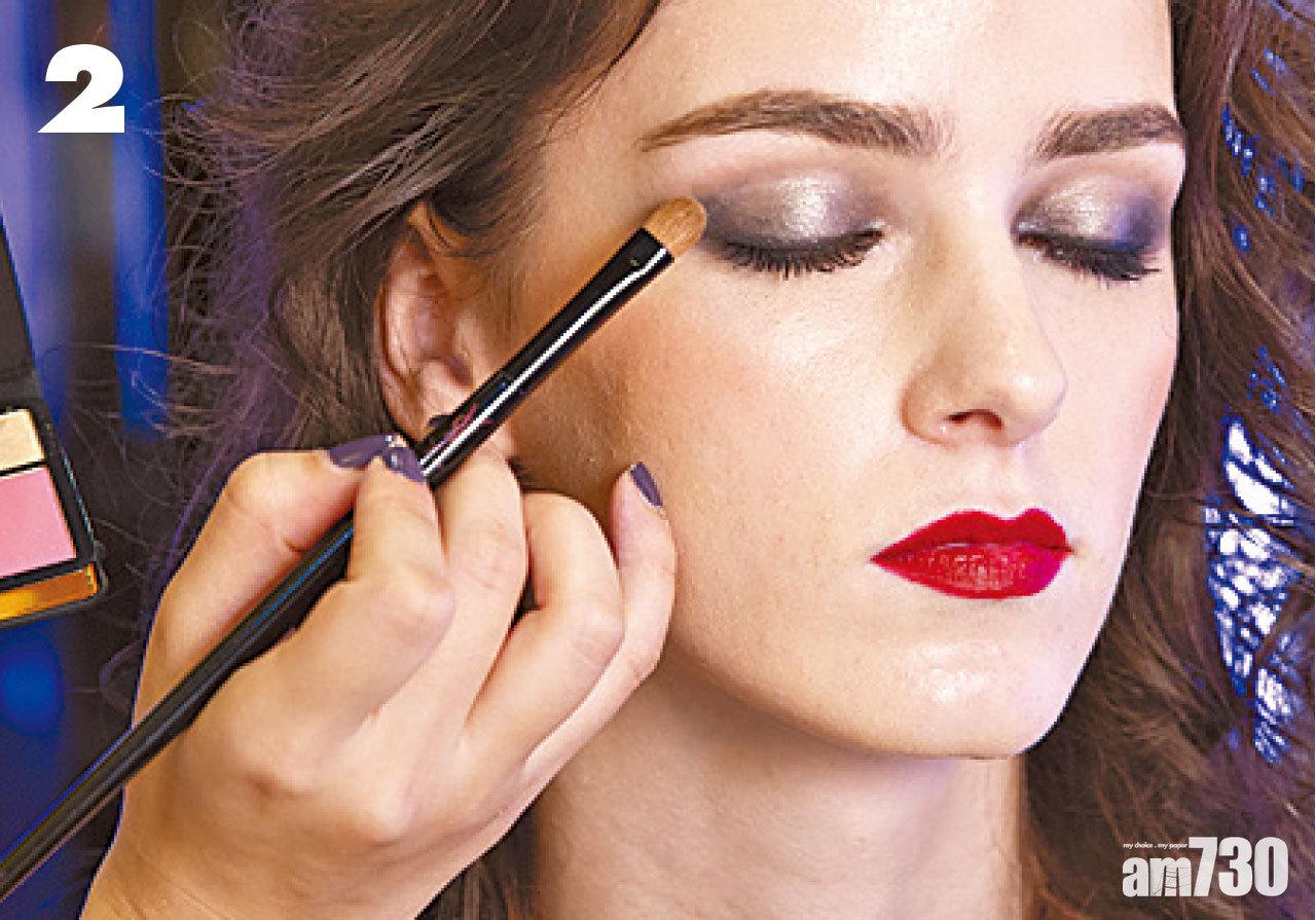 2.眼妝用上用途彩妝盒,先以灰色眼影打底,並在眼頭及眼尾位置加重灰色,中間位置就以淡金眼影打亮,彩妝盒還有一款銀色眼影膏,用少量於下眼線及眼頭,令眼妝更有層次。