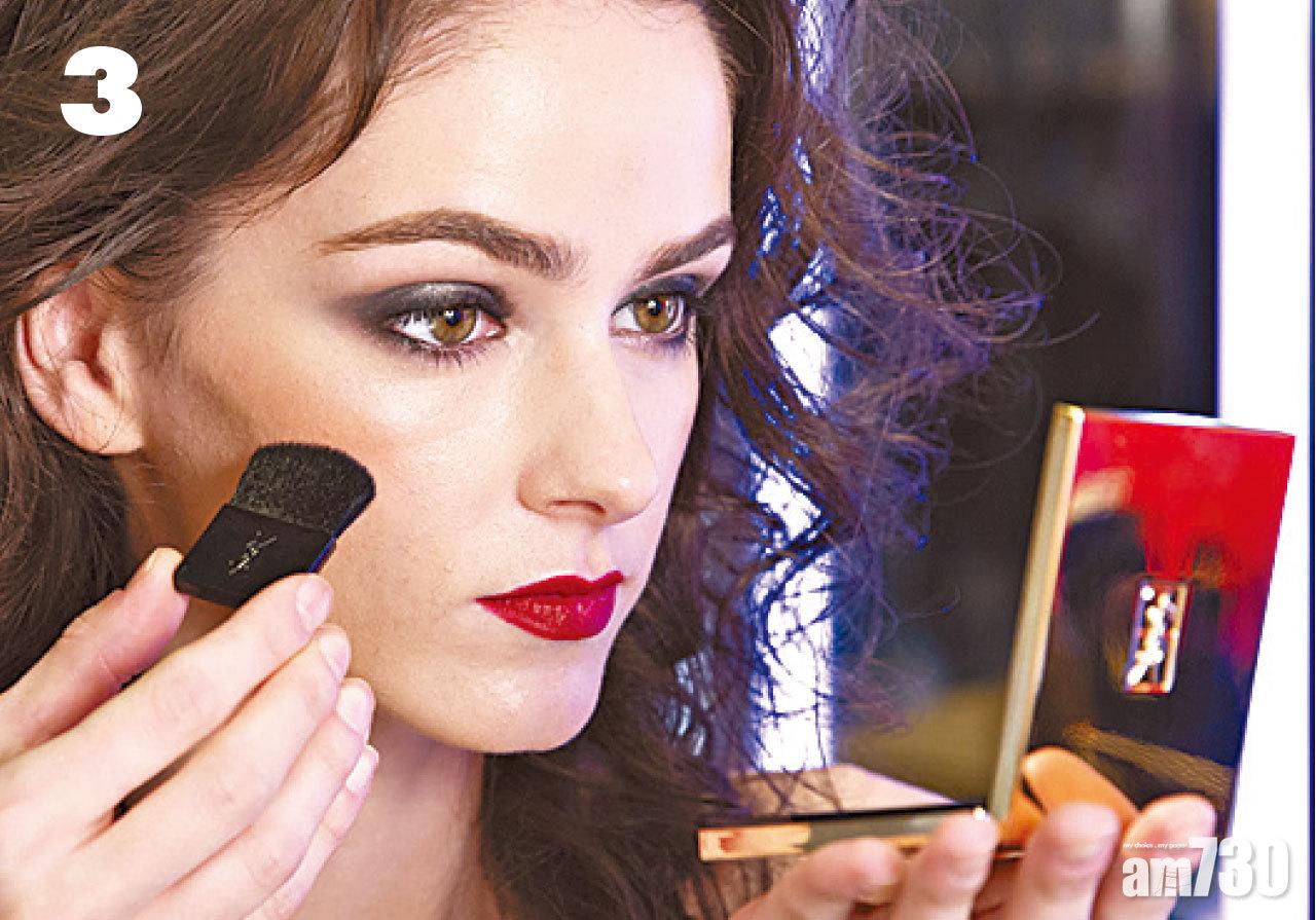 3.先掃上粉紅色的絲滑透薄光影粉,令肌膚展現光澤感,之後再掃上粉紅絲滑胭脂,打造自然好氣色。