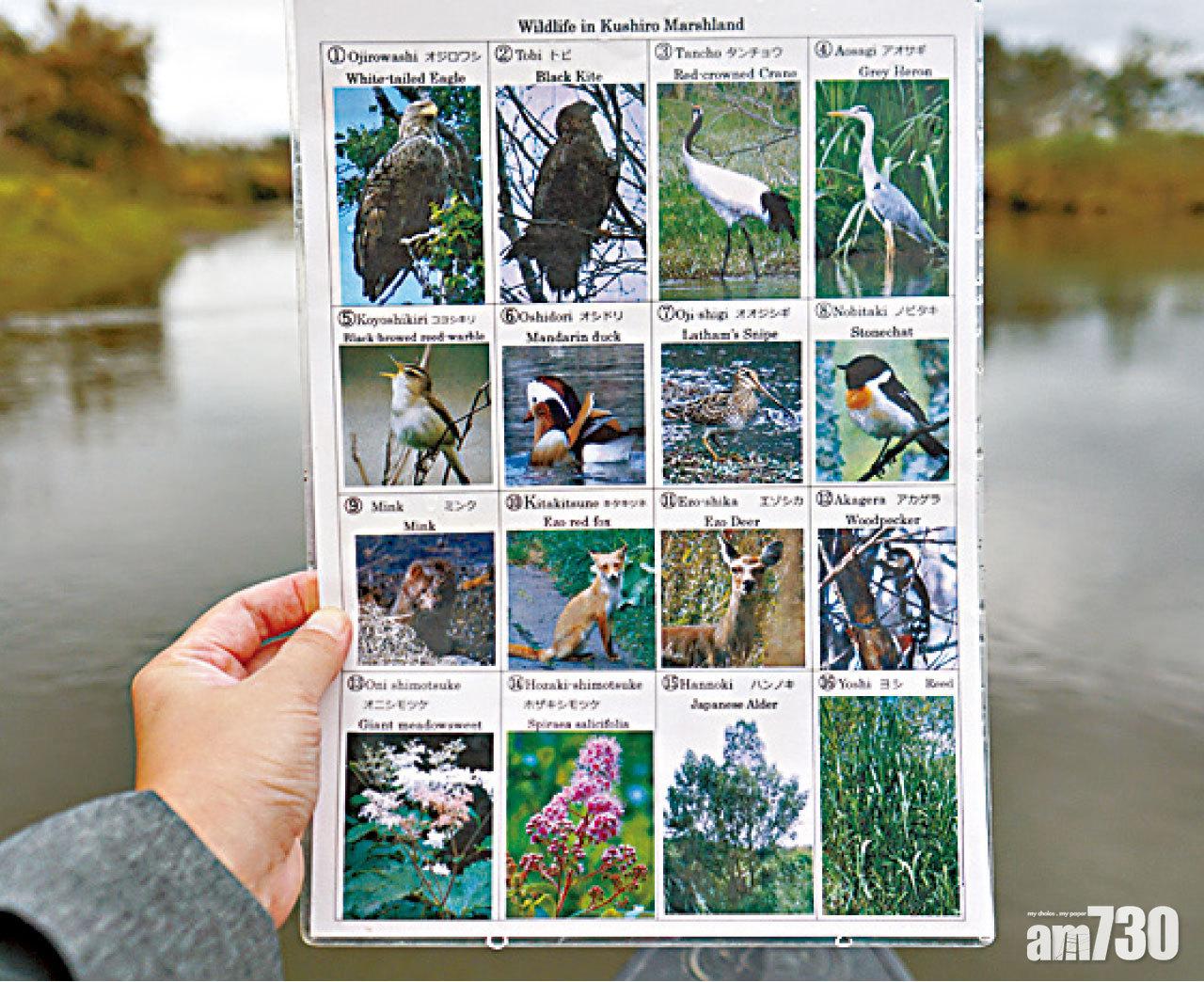 曾經看過明信片,兩隻丹頂鶴在白雪的濕原起舞,可惜當日運氣不夠,未能看見丹頂鶴。同行教練會說一點點英語,邊划舟邊留意四周景物,一有動靜,就叫我們看看說明圖是幾號的雀鳥,鴛鴦、黑喉鴝、灰鷺、黑眉葦鶯、白尾鷹、啄木鳥等都一一出現。