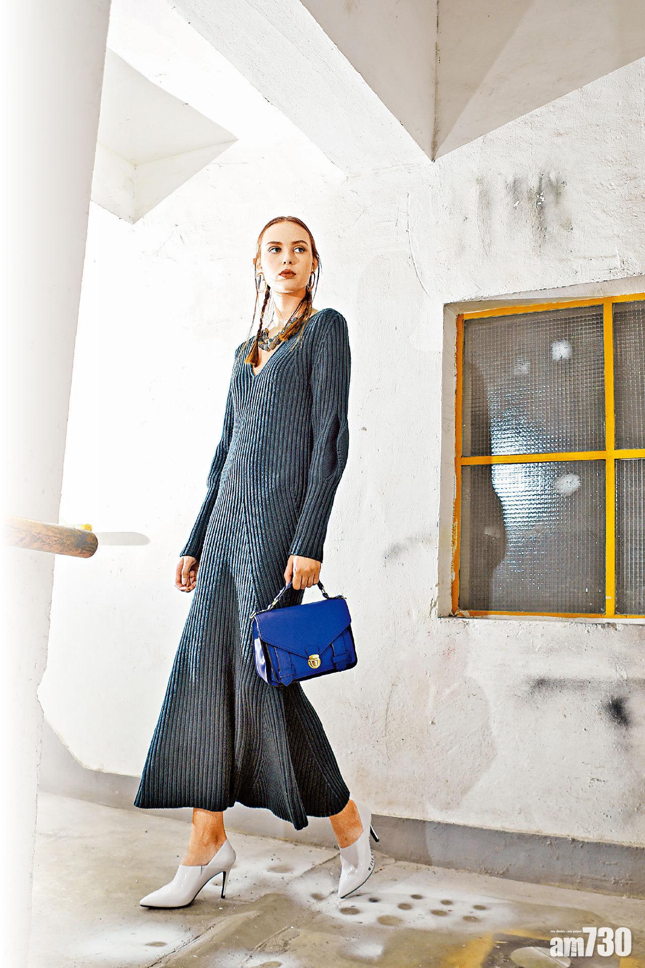 白色slogan漆皮高跟鞋 $1,399 (a); 墨綠色針織連身裙 $1,500 (e); 彩藍色小手袋 $420 (d); 金屬圈耳環 $85 (d); 綠色珠串頭頸鏈 $240 (d)