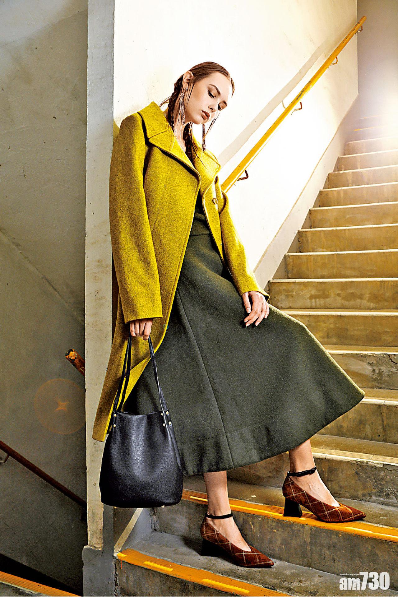 啡色格紋羊絨粗跟鞋 $1,399 (a); 青色大褸 $2500 (e); 深綠色low-cut連身裙 $890 (e); 黑色皮手袋 $998 (b); 流蘇耳環 $170 (d)