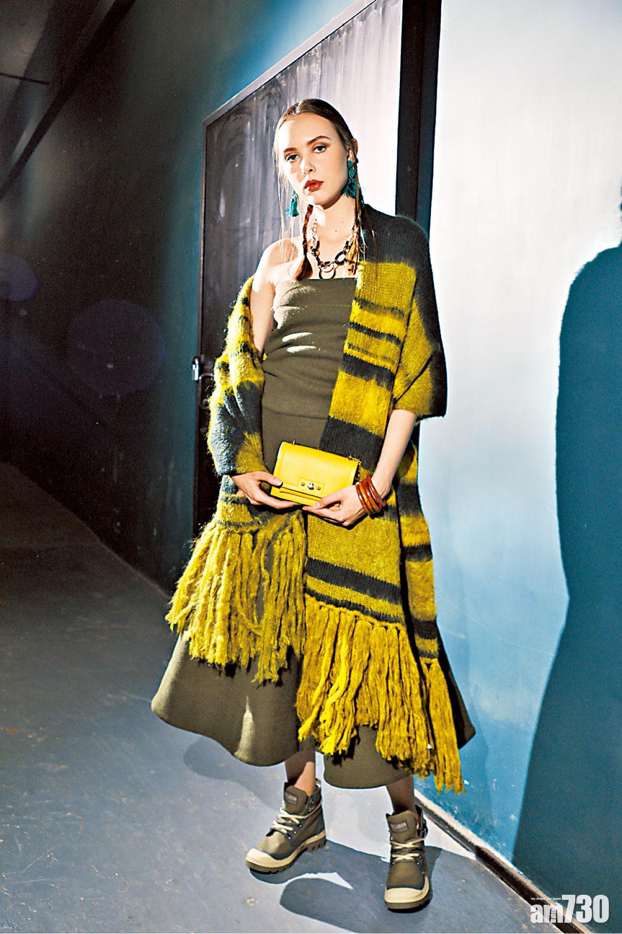 墨綠色短boots $680 (c); 青色拼灰黑流蘇圍巾 $990 (e); 深綠色 low-cut連身裙 $890 (e); 芥辣黃mini chain bag $280 (d); 木手鈪組合 $112 (d); 湖水綠流蘇耳環 $140 (d); 黑白金屬頸鏈 $240 (d)