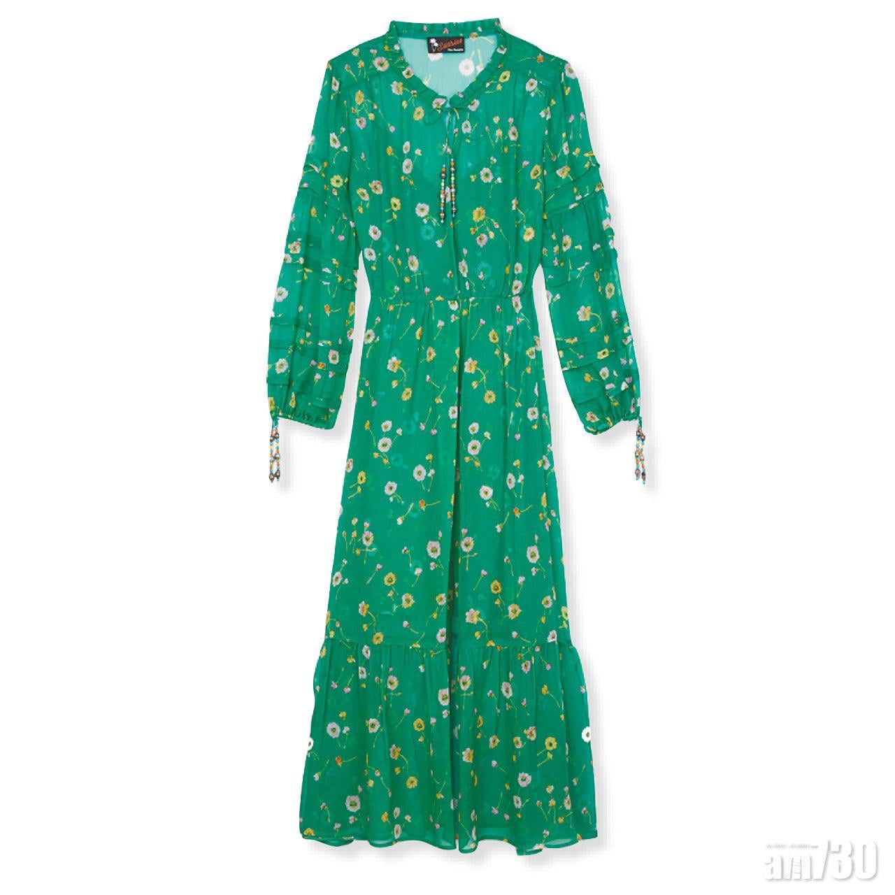 闊袖wrap top與及地長裙上布滿大大朵的小雛菊,視覺效果十足之餘,亦演繹不同的綫條美。(TOP $2,325、Skirt $2,735,Whistles)