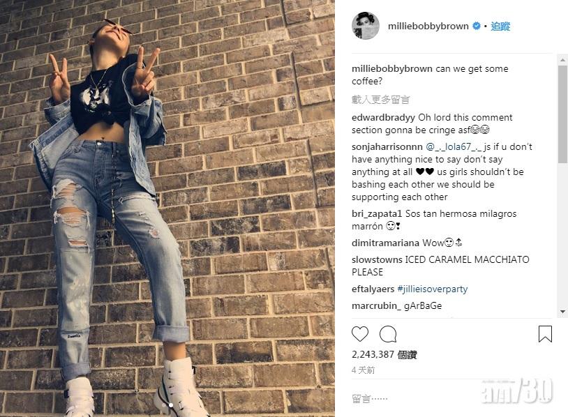 憑劇集《怪奇物語》(Stranger Things)走紅的14歲童星「Eleven」米莉芭比布朗(Millie Bobby Brown),日前宣布與年長她一歲的男朋友分手,不過無損其人氣。她在宣布分手前數天於ig上戴數張近照,穿上優閒服飾品牌AMERICAN EAGLE Vintage的高腰牛仔褲及工人褲,大擺甫士高舉勝利手勢,又與劇中飾演Dustin 的演員Gaten Matarazzo攬攬,似乎未有情傷影響。
