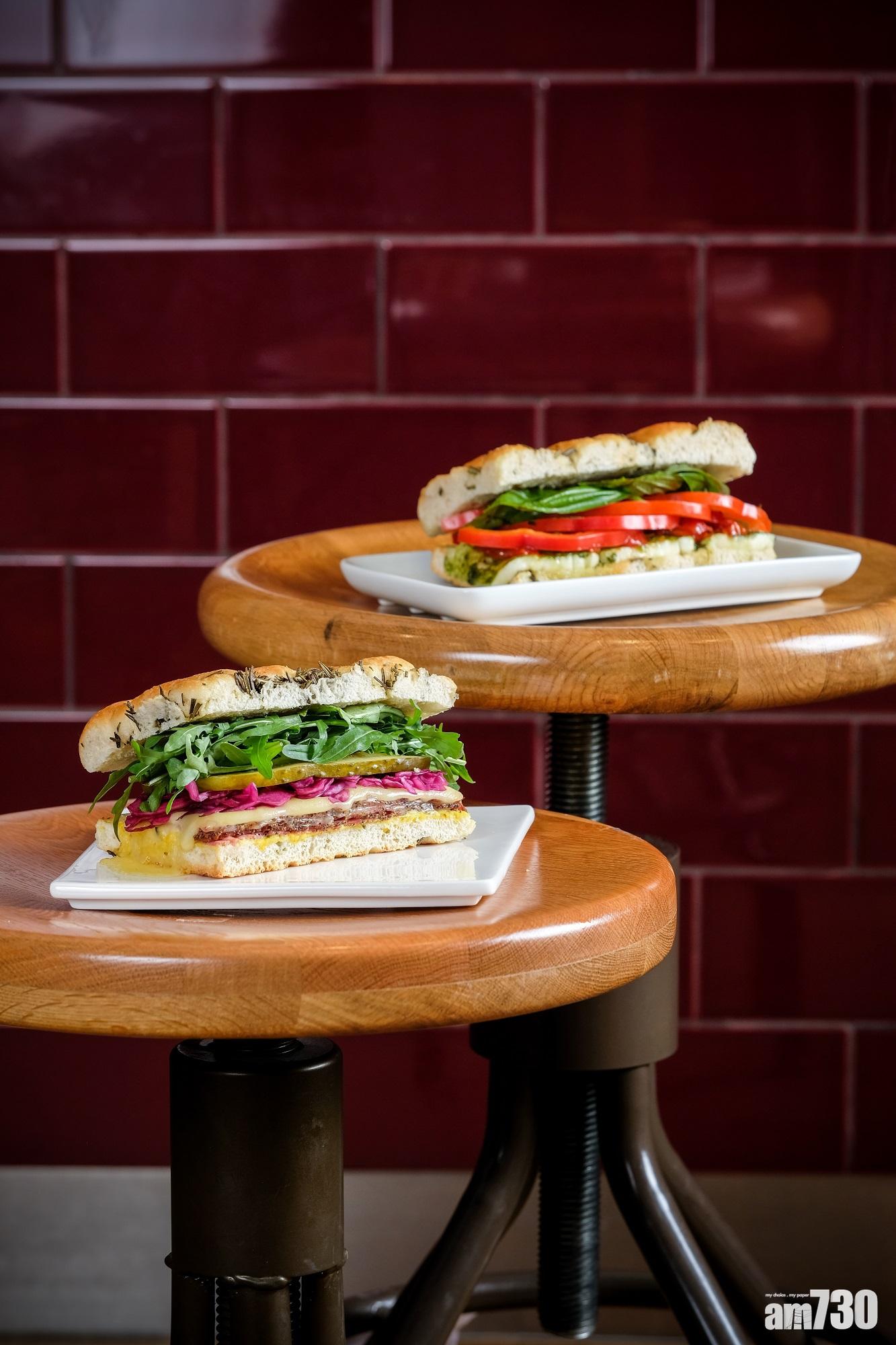 香草意式包系列──煙燻牛肉酸瓜意式香草包及哈羅米羅勒醬烤番茄意式香草包。$53