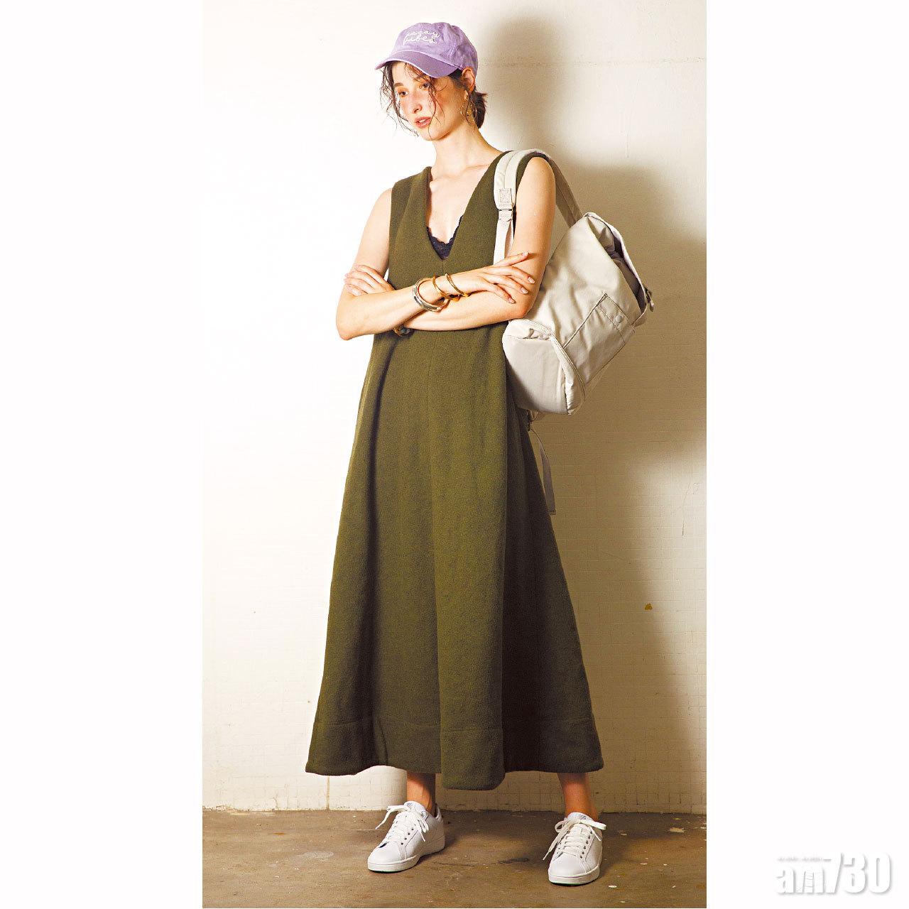 杏色Montana背囊 $390 (a) 深綠色V領背心裙 $890 (e) 黑色喱士bra top $239 (f) 粉紫色cap帽 $170 (f) 白球鞋 $499 (d) 金色幾何耳環 $100 (c) 金屬手鈪 各$100 (c)