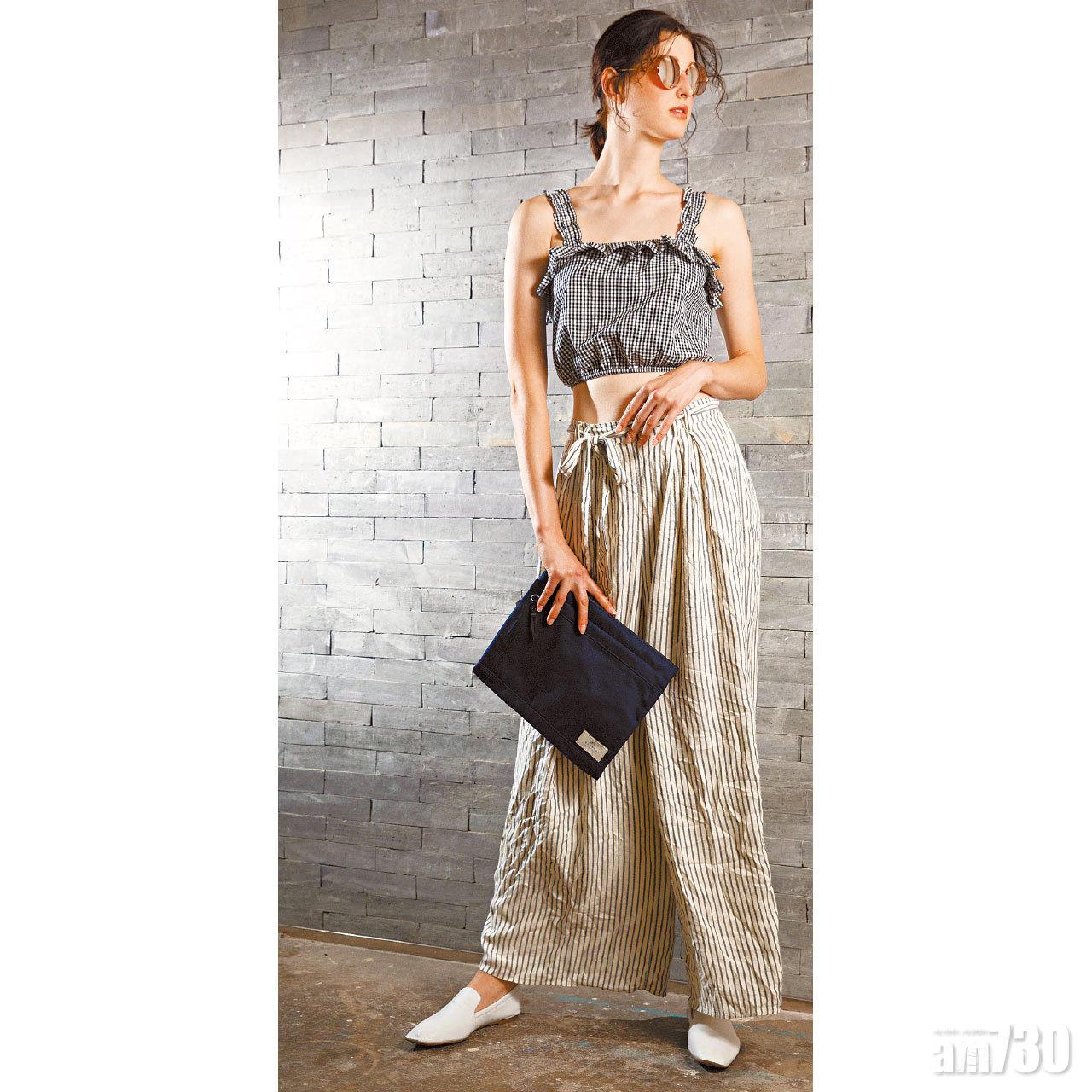 黑色Dipper Bag $240 (a) 黑白格仔ruffle背心 $340 (f) 米x藍條子闊褲 $490 (f) 白色皮革平底鞋 $1,190 (g) 玫瑰金圓形太陽眼鏡 $150 (f)