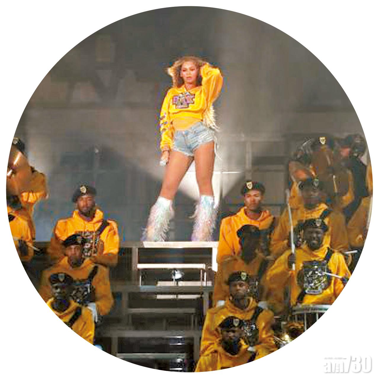 Beyonce原定去年在Coachella音樂節掛頭牌演出,但臨陣宣布陀B而最終缺席。今年她穿上Balmain設計師Olivier Rousteing度身訂造多件服裝,有華麗而貴氣的黑金埃及風斗篷、閃亮亮的迷彩軍裝及hoodie配牛仔短褲,為觀眾帶來視覺上的震撼。