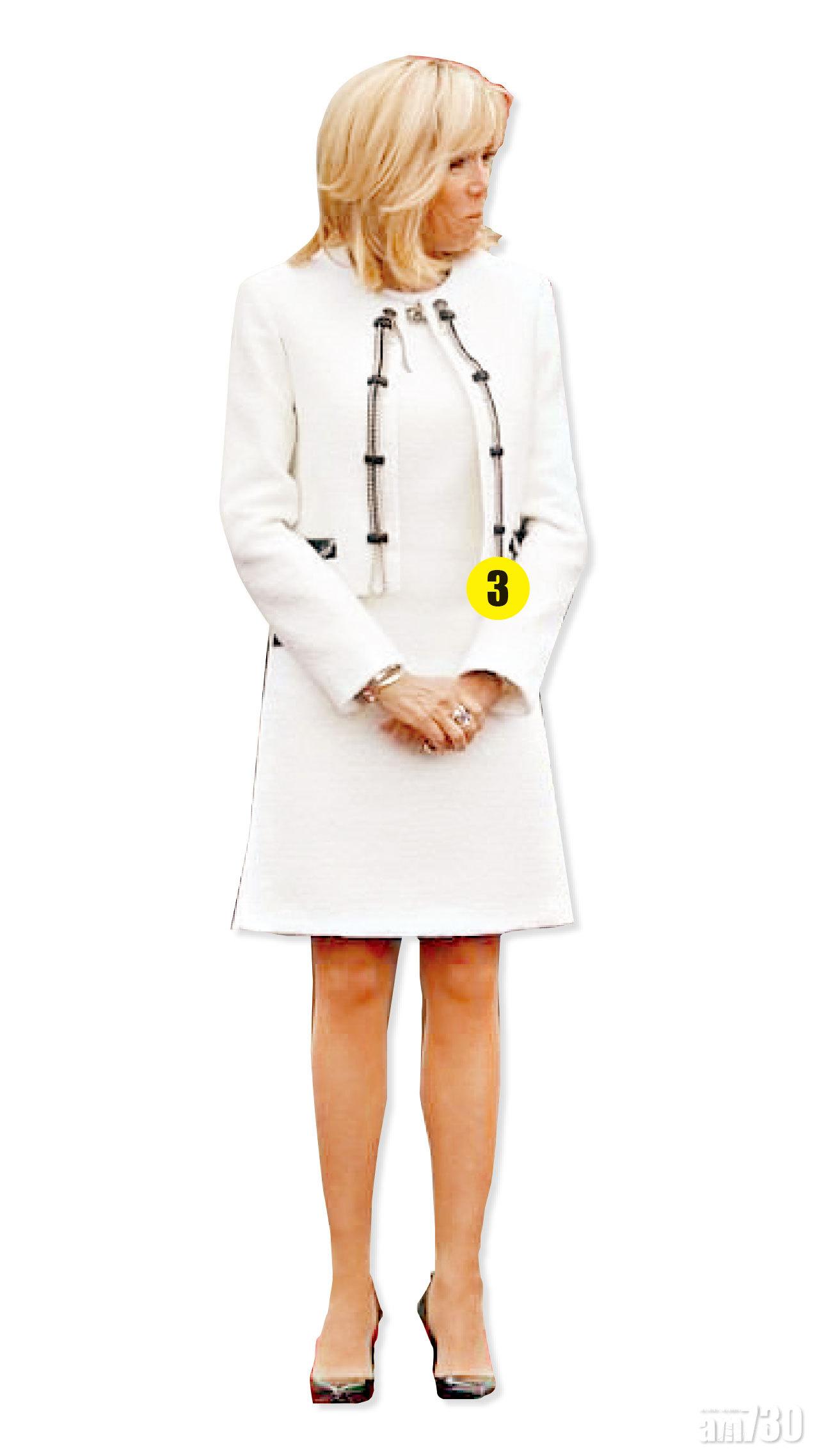 法國第一夫人布麗吉特(64歲)老妻配少夫,與美國第一夫人梅拉尼婭(47歲)的老夫少妻誠是強烈對比。幾乎當得上梅拉尼婭媽咪的她,在法式優雅裝身下,絕不遜色,從抵埗的LV粉紅絨大衣(圖2)、逛草坪的嫩黃套裙、禮壇上的清麗白套裝(圖3),以至國宴的LV奶白曳地晚裝(圖4),堪作年長女性的典範指引:自在自信,毋須被年齡規限。