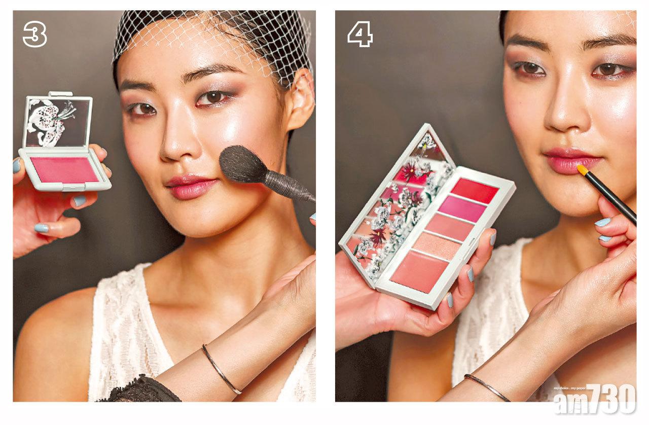 3. 胭脂用上橙紅色的Loves me,化妝師表示,今次胭脂的色素較濃,上面前可以先在手或紙巾上掃一下,有效控 制分量,出來的感覺更自然。