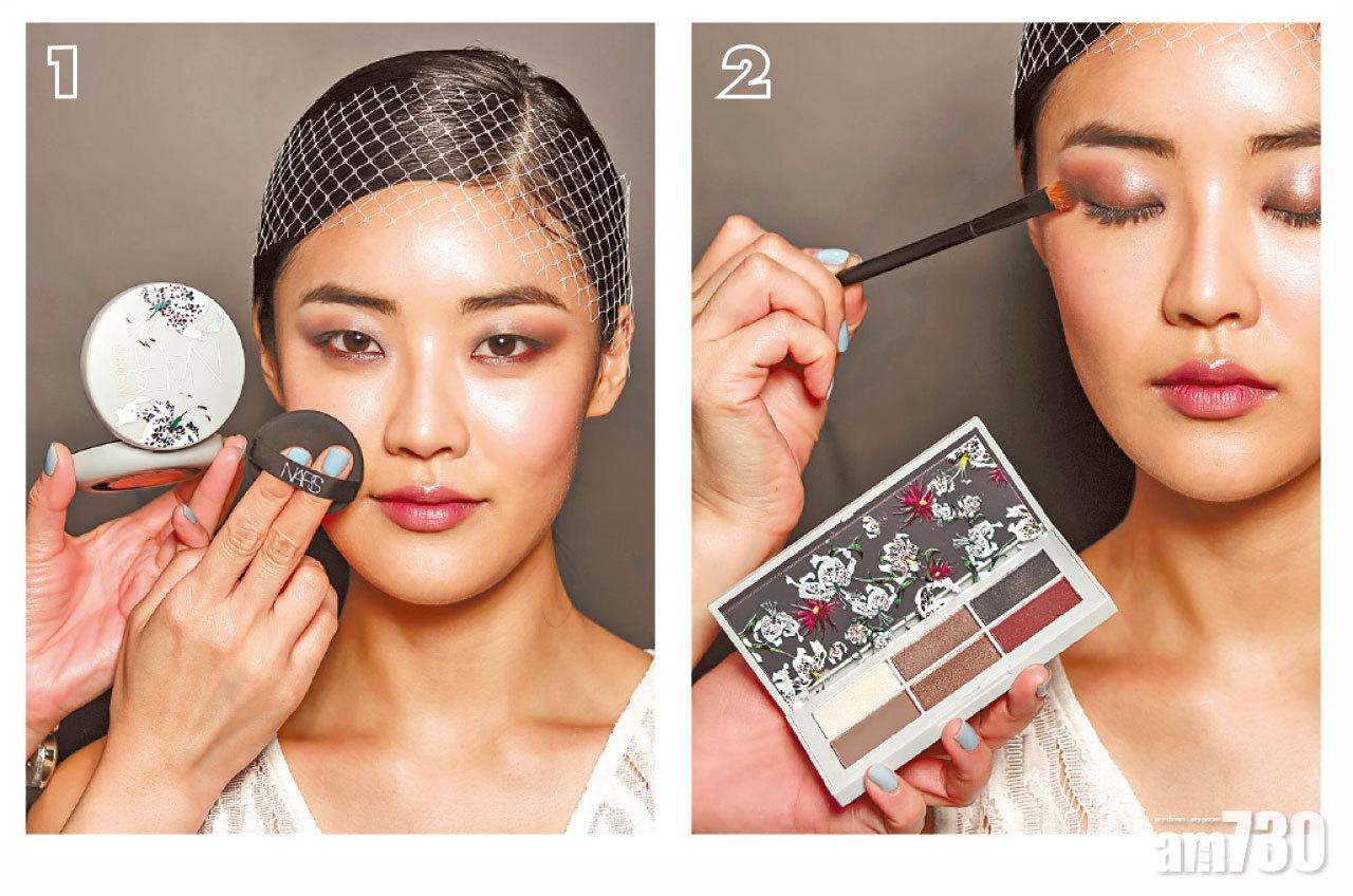 1. 今次用上兩種顏色的氣墊粉底,除了模特兒原本的膚色外,亦用了白一至兩度的氣墊粉底作打亮。