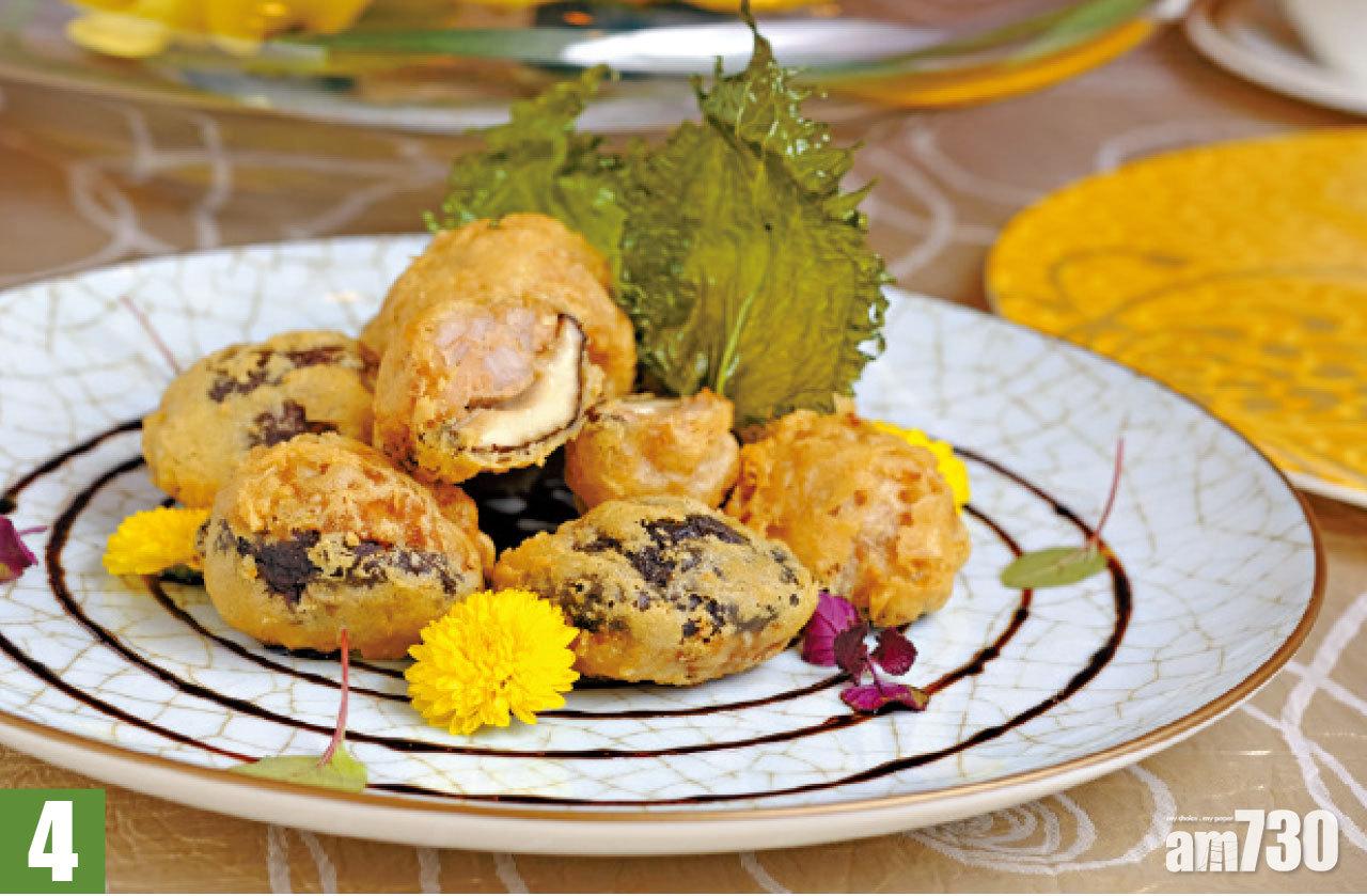 4. 「萬豪中菜廳」意醋香酥善玉鮮菌,將Omnipork與蓮藕釀入冬菇內,沾上粉漿酥炸,香口又有咬口。