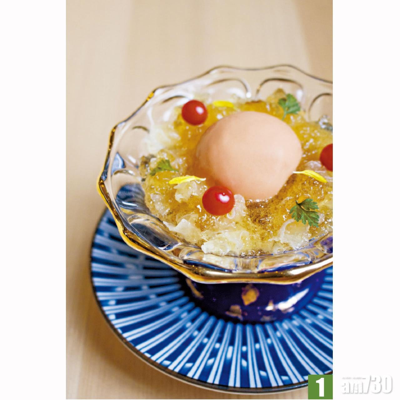1.番茄豆腐伴千鳥醋啫喱,中心呈粉紅色的特製番茄豆腐,以意大利牛心番茄、荷蘭串番茄及日本迷你番茄三種特別品種番茄,加入豆乳及葛粉手製而成,繼而配上自家製千鳥醋啫喱,酸酸甜甜誘發阿媽食慾。