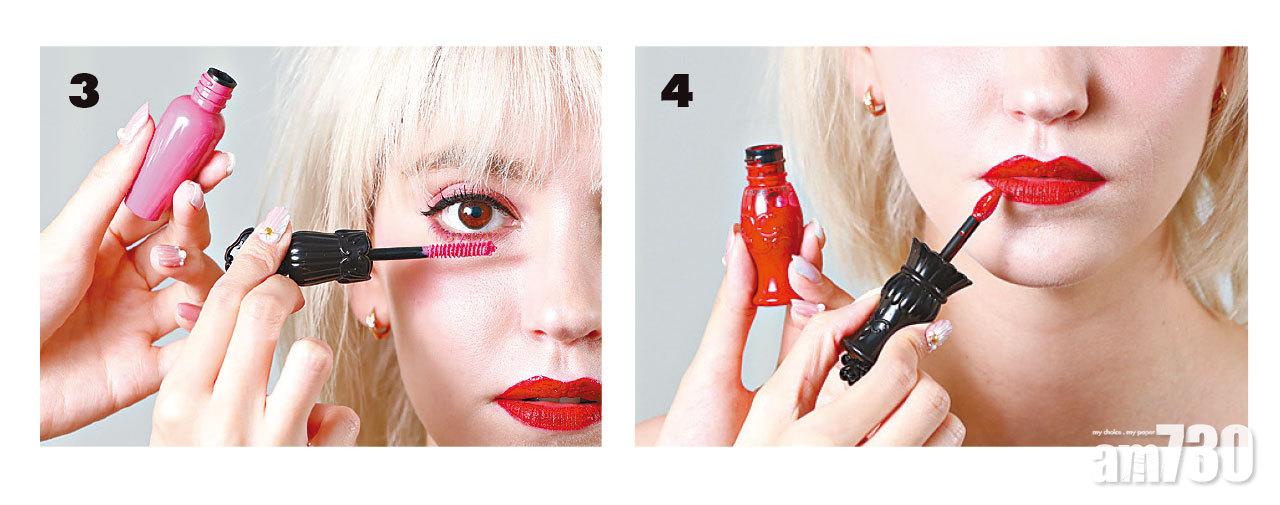 3. 防水睫毛液推出粉紅、橙紅及黃色等大膽色彩,顯色之餘更有濃密效果。今次將粉紅色用於下眼睫毛位置,呼應紅色眼妝。