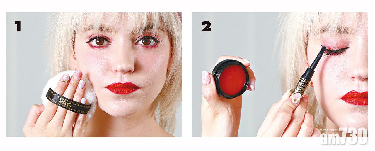 2. 眼妝用上多效閃粉霜,在近眼線位置塗上紅色的多效閃粉霜,帶來閃爍效果,再以防水眼線筆畫上眼線。模特兒更用上紫色的閃粉霜於頭髮作highlight。