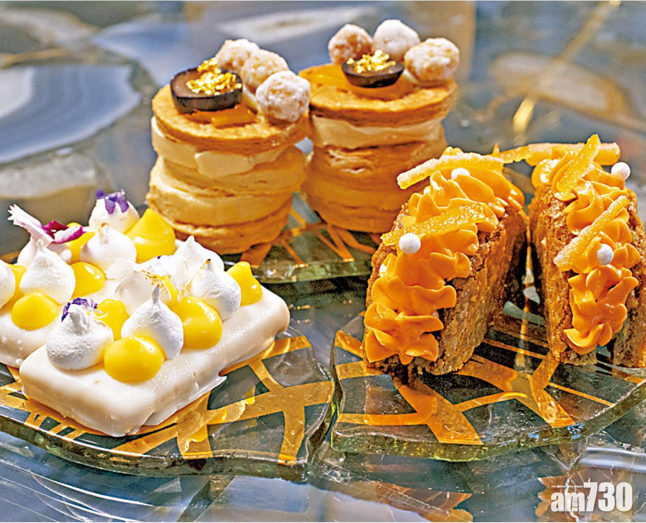 法式檸檬塔(前左)飾以原味及檸檬味蛋白霜,加上食用花非常漂亮,白色糖皮也夠鬆脆。(前右)香橙黃油餅乾質感有點像cupcake,那道橙色唧花猶如女皇禮服上的喱士衣袖。