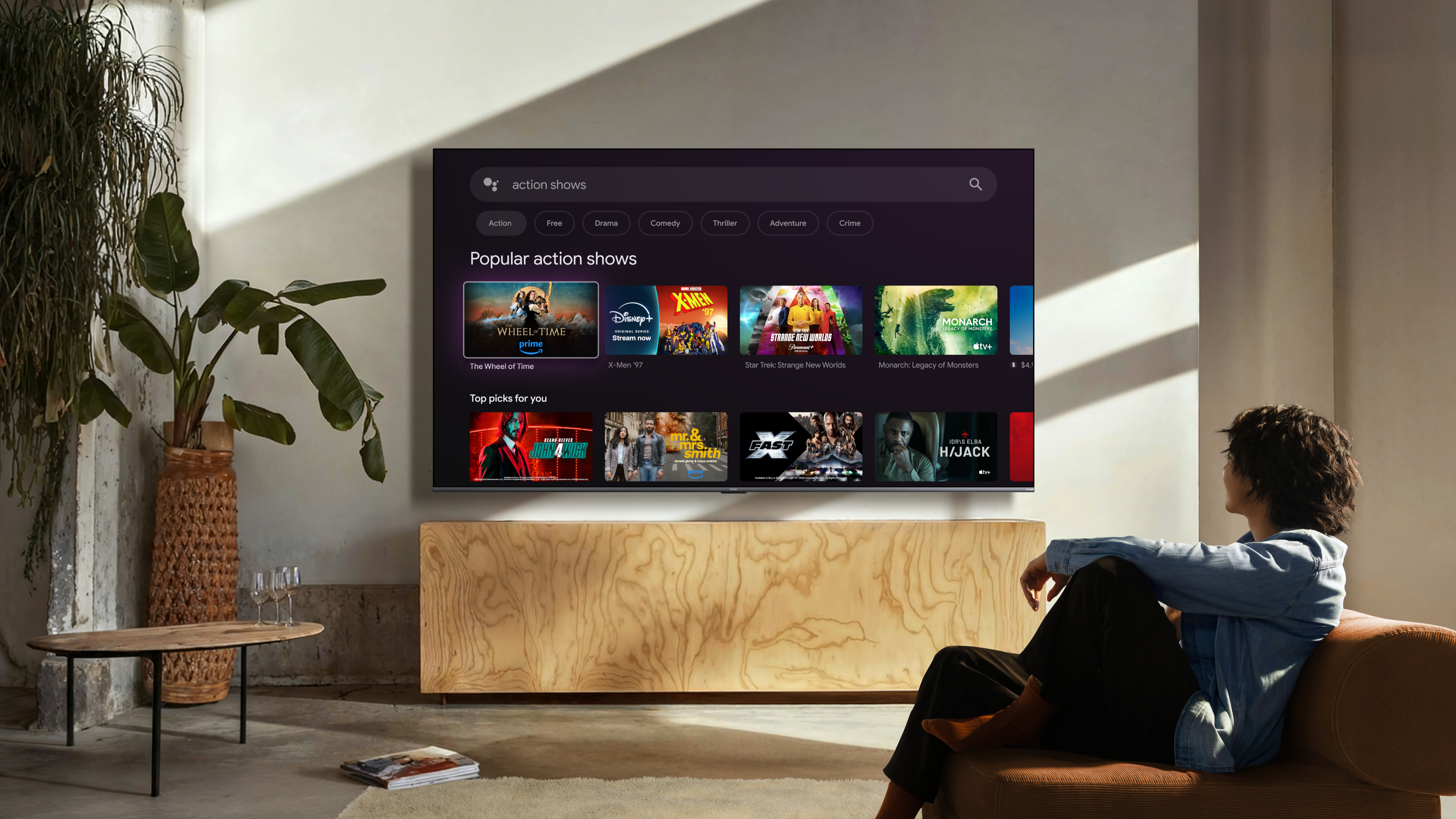音效方面,雙15W揚聲器搭載Dolby Atmos杜比全景聲與DTS:X,音效更沉浸,對白、音樂與音效呈現影院級平衡感,無需外接揚聲器,即可播放環繞音效。系統支援Google TV、Apple AirPlay、Google助理、Google Play和Google Cast,預設Netflix、Prime Video和YouTube,裝置串流與投射無縫接軌,同時也支援Filmmaker Mode,呈現影院級畫面。