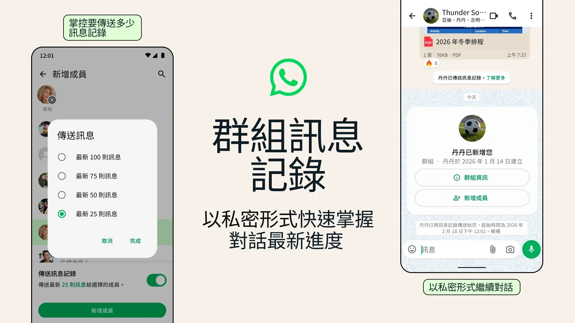 無論用戶使用什麼裝置,WhatsApp群組訊息記錄與其他所有個人訊息一樣,會保持端對端加密,可以更快速且私密地進行對話,無需再額外傳送螢幕截圖或轉寄訊息。在群組對話中新增新成員後,用戶會看到可傳送最近訊息給對方的選項,可最多傳送25至100則訊息。確保新成員只需閱讀最相關的近期內容,而整個群組可以輕鬆看到已分享的訊息。