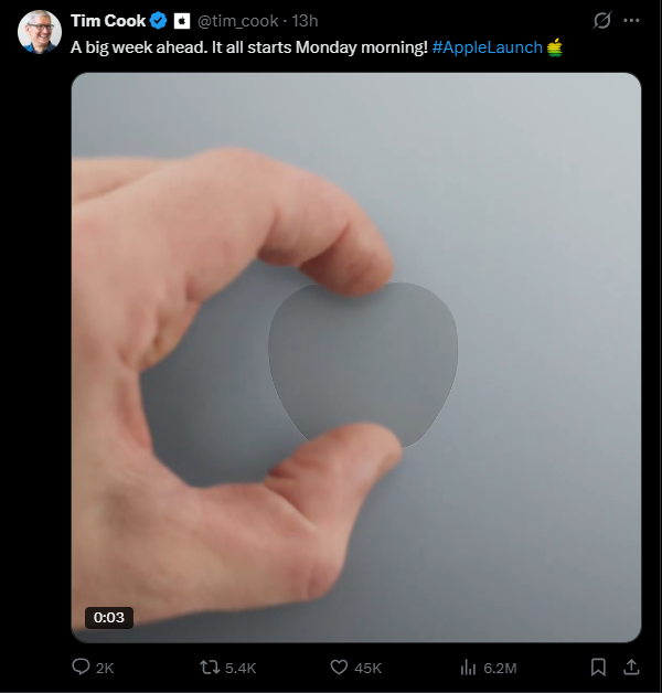 Tim Cook於X上宣布下星期將會是重大Apple發布周。