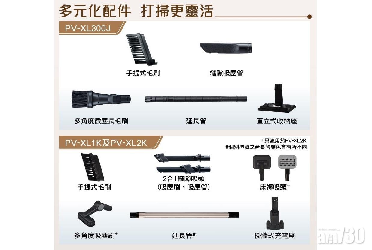 三大型號皆備有多元化配件,讓用家靈活調配,不論是狹縫暗角,還是天花角落均可輕鬆打掃。特別一提PV-XL2K特有的床褥吸頭能吸淨床單床褥;多角度吸塵刷能調教角度處理難以觸及的高處,如天花角落或衣櫃頂部等堆積的灰塵。