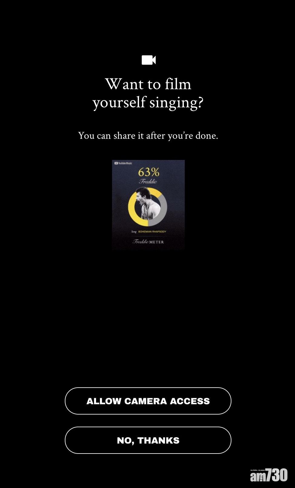 開始測試前,需要授權程式取用咪高風和鏡頭,用戶可以選擇拍下唱歌的影片以便放到社交網絡分享。