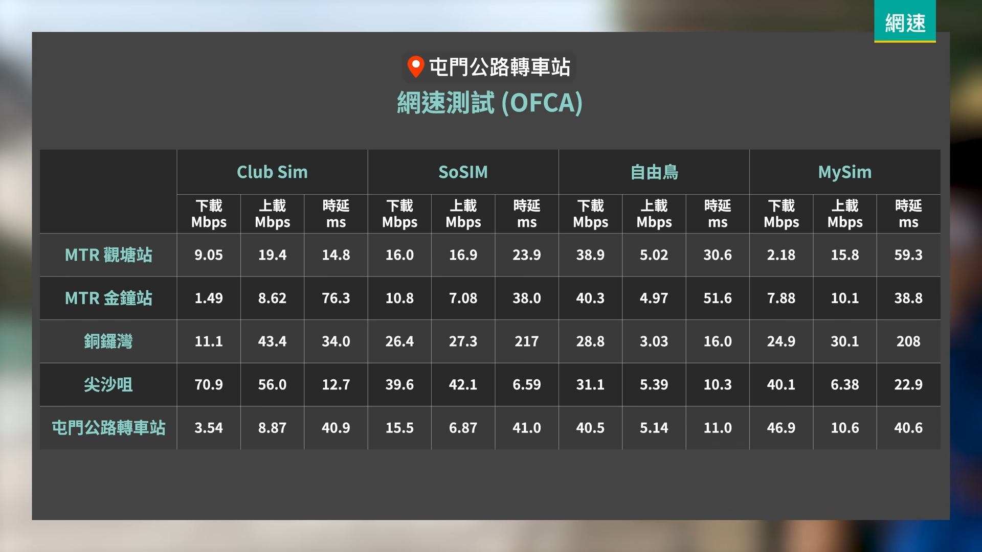 然而,在戶外的巴士轉乘站,Club Sim在這個地方的網絡表現就稍微不佳,而MySim和自由鳥的表現則相對較出色,我們在下班時間的黃昏六點進行測試,MySim和自由鳥的下載速度都可以達到40Mbps,相較之下,Club Sim連4Mbps都無法達到。