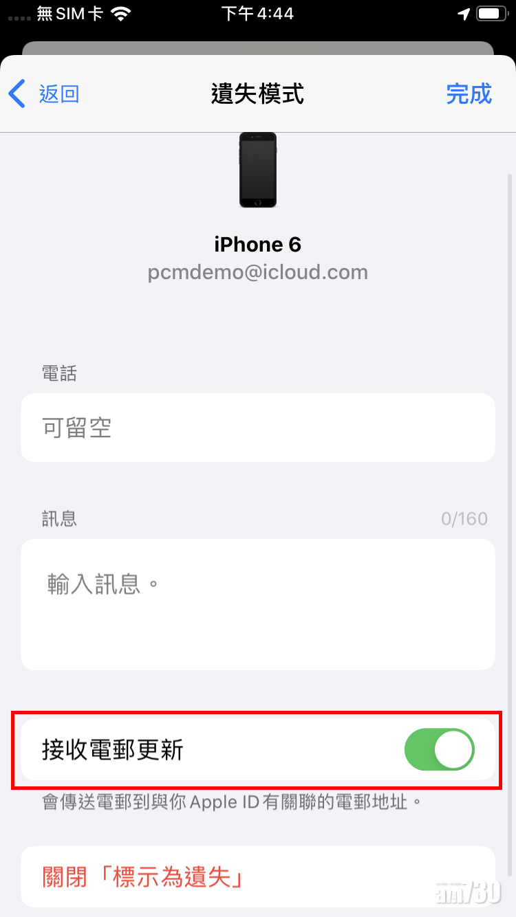 用戶可在遺失模式中選擇接收電郵更新,隨時知道遺失裝置的最新情況。