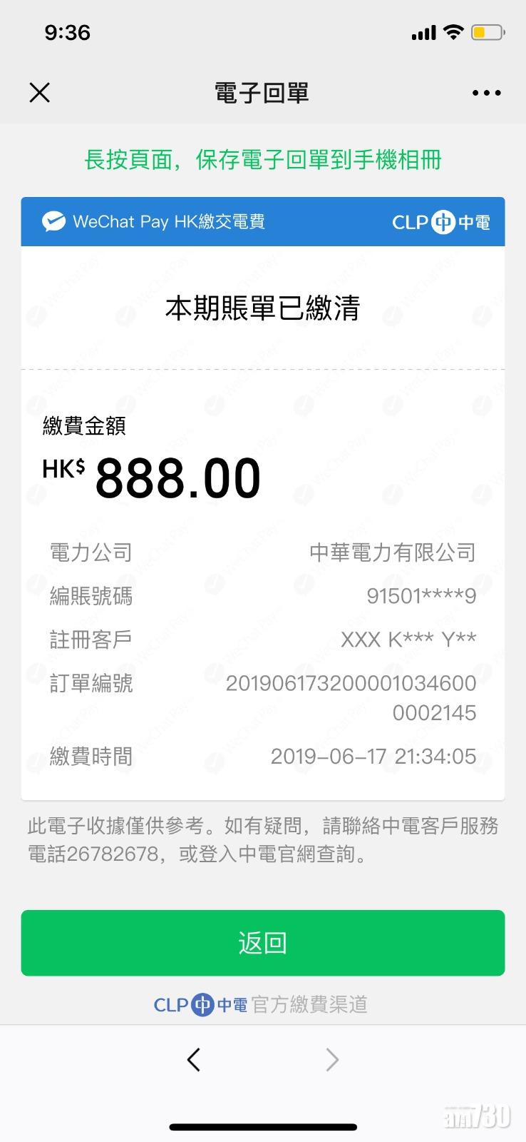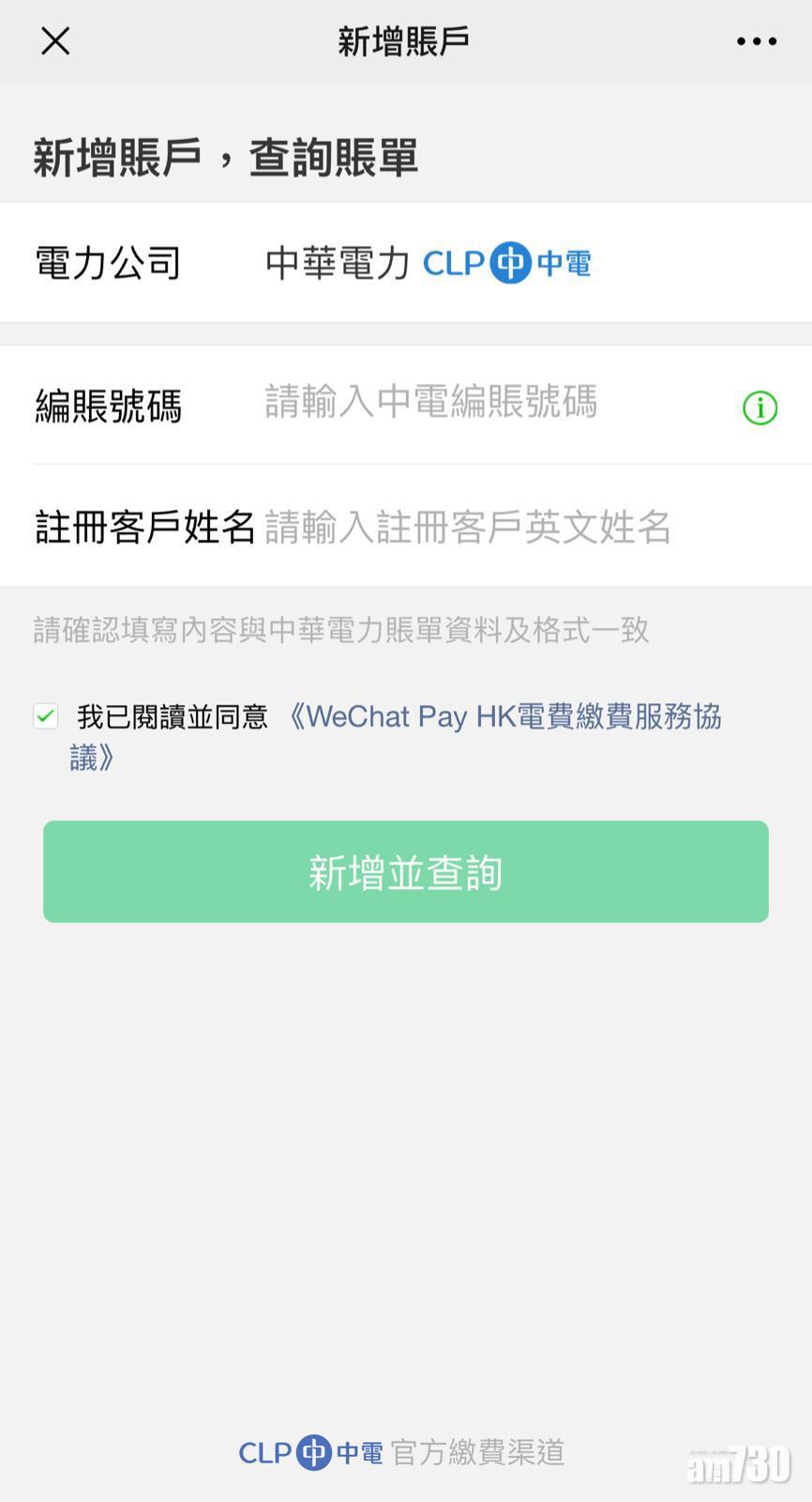 綁定中電帳戶的編帳號碼和用戶名稱就可以用WeChat Pay交電費。