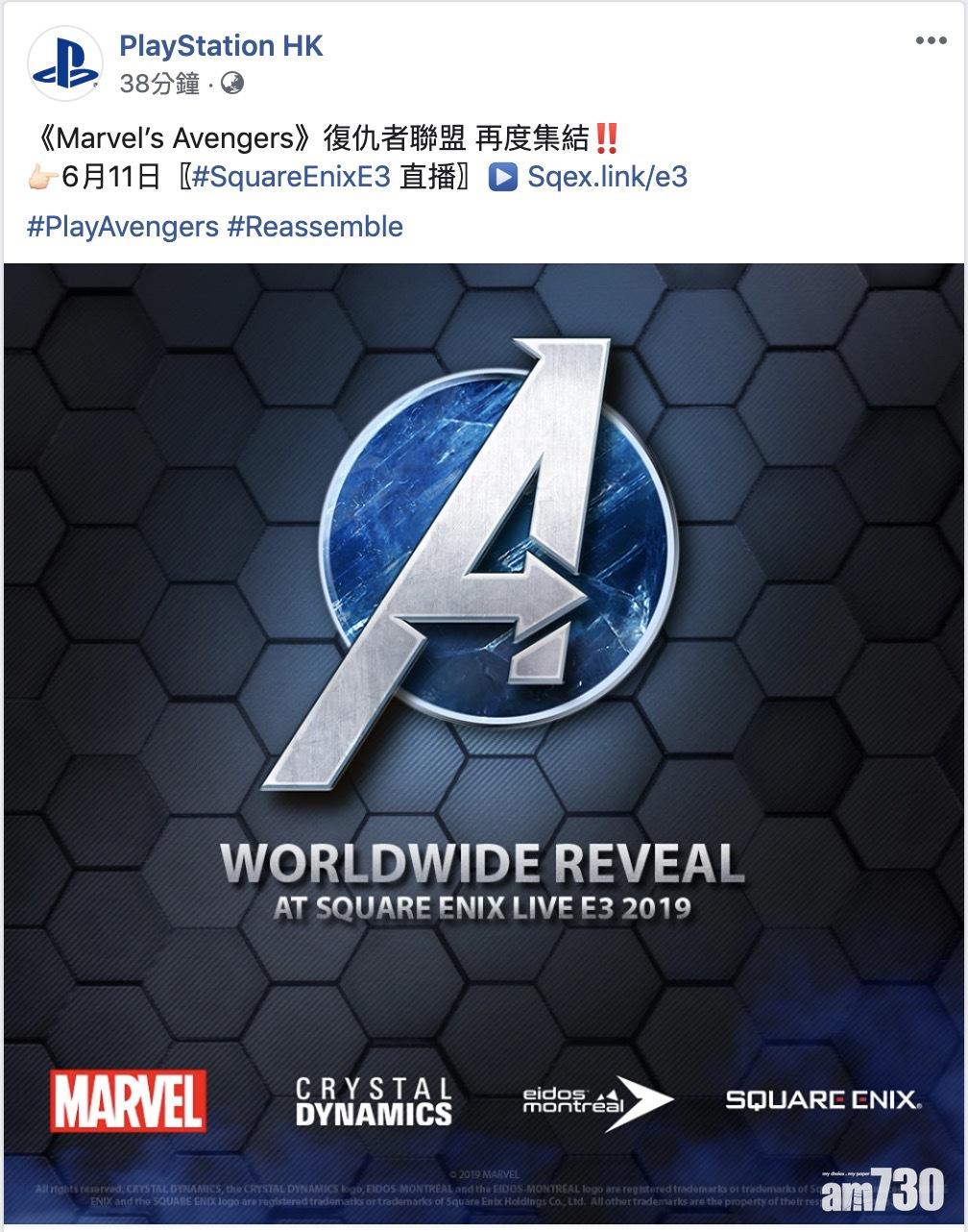 Marvel透過Twitter公布Square Enix將於香港時間6月11日上午9時,於E3發表會公布《Marvel’s Avengers》的詳情,屆時將進行現場直播。
