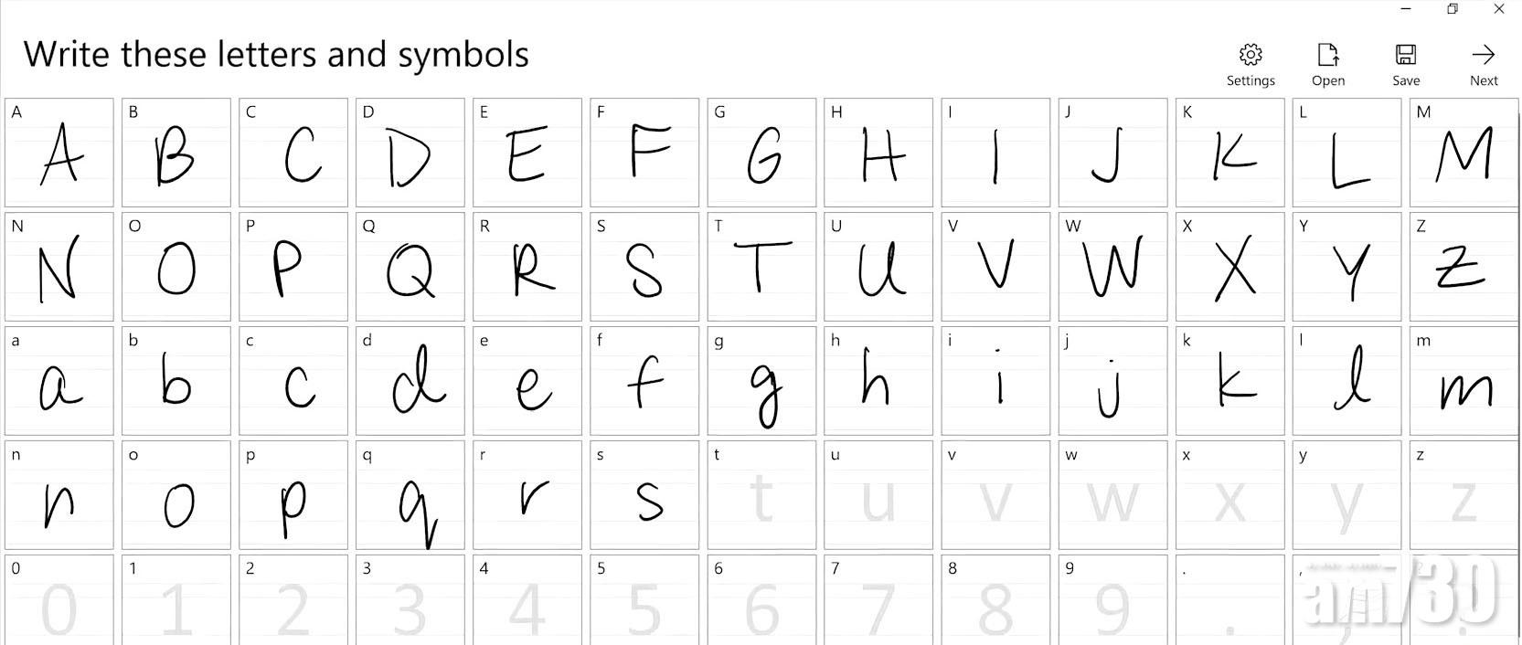開啟程式後,會見到各大小寫英文字母和符號的方格,你需要像copy book一樣在格內寫上各字母;