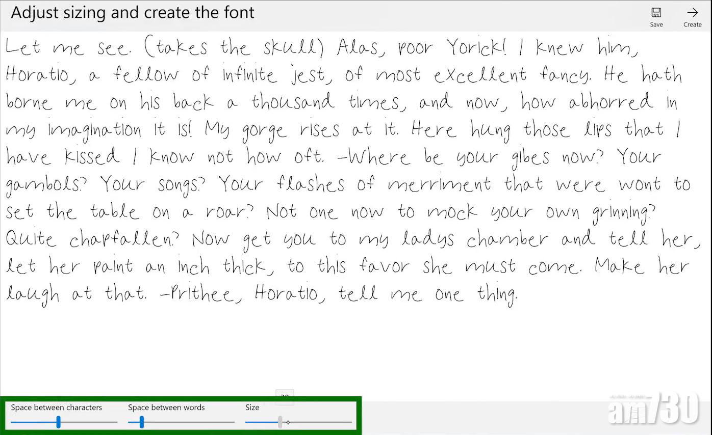 寫好後,可以調整字距、詞距和字體大小,按右上角的Create便會在「Documents」文件夾裡建立TTF字體檔;