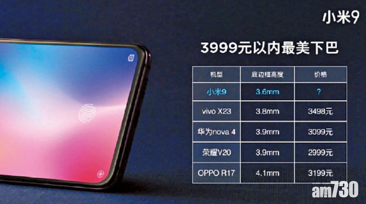 另外,該公司已確認小米9採用高通最新旗艦Snapdragon 855處理晶片,而雷軍早前更發布一張比較圖片,展示小米9的底邊框僅3.6mm,較上代小四成,比Vivo X23小0.2mm,而圖片也確認新手機具備屏幕指紋感應器。
