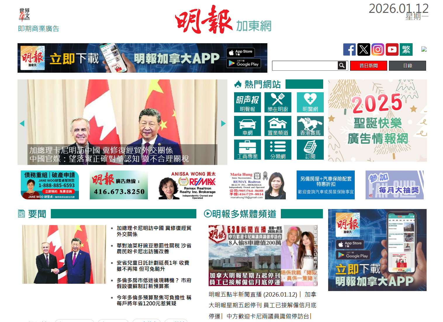 1993年創刊的《加拿大明報》33年歷史告終,該報報道,員工周一(12日)收到香港總公司的終止僱用信通知,表示該報將營運至1月31日,多倫多及溫哥華的實體報將於周六(17日)起停刊,有員工對消息一度愕然,惟不感完全意外,因一年多前入職時已得知公司經營困難。《加拿大明報》的管理層表示,停運決定由香港總公司作出。