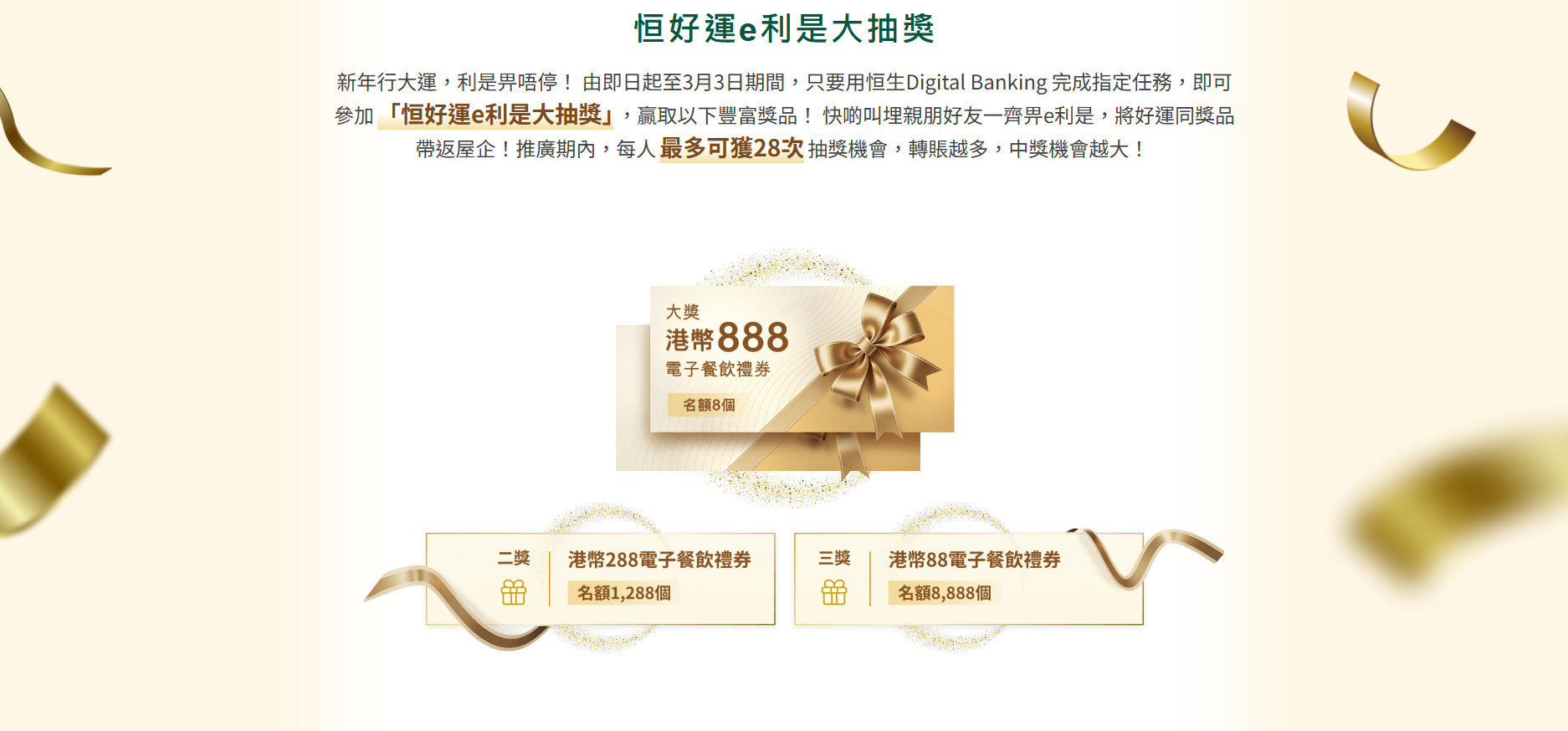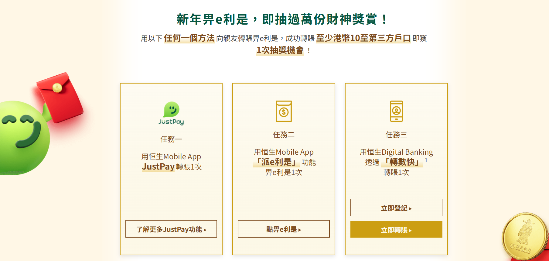 由2月6日至3月3日期間,只要用3個方法,JustPay、「派e利是」功能及「轉數快」向親友派利是,即可參加「恒好運e利是大抽獎」,贏取豐富獎品,大獎8名可獲888元電子餐飲禮券。每人最多可獲28次抽獎機會,轉賬越多,中獎機會越大。