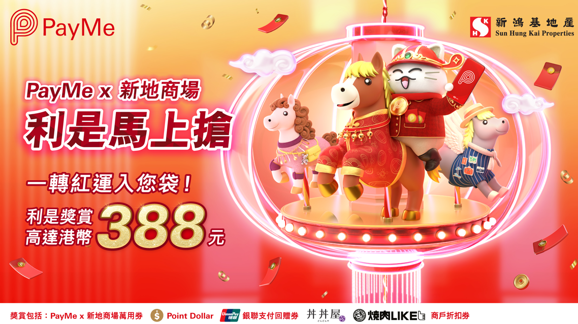 此外,2月10日至28日,顧客只需親臨參與活動的新地商場,使用手機掃描實體或電子屏幕上的二維碼,有機會獲得高達388元的PayMe x新地商場利是萬用券、或高達288元的Point Dollar獎賞。