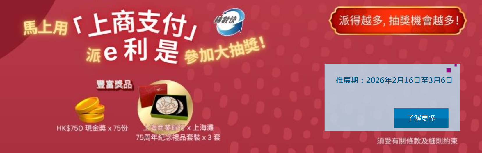 上海商業銀行表示,由2月16日至3月6日期間,18歲以上的上商個人客戶使用「上商支付」的「e利是」功能成功派發港幣或人民幣20元或以上的e利是,即可獲得一次抽獎機會,機會次數不限,但只限中獎一次。