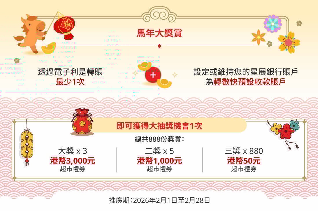於2026年2月28日或之前,透過星展電子利是為親友送上佳節祝福,同時參加大抽獎,有機會贏取高達3,000元超市禮券。