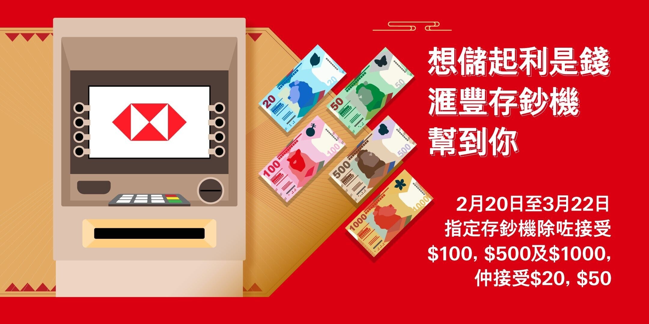 滙豐銀行宣布,由2月20日至3月22日,指定存鈔機除了接受100元、500元及1,000元紙幣外,還接受20元及50元紙幣。