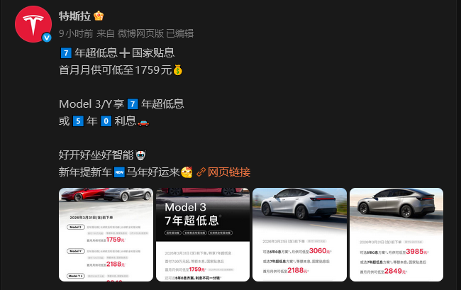 美國電動車製造商特斯拉(Tesla)在中國於周四(26日)宣布,推出新一輪買車分期優惠,在3月31日前下單,全系車型可享7年超低息貸款,其中Model 3、Model Y及新推出的Model Y L更提供5年免息方案,即貸款買車無需支付利息,被業界視為「變相減價」。